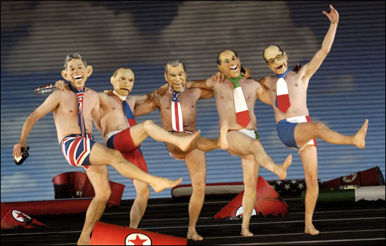 «Robert Carsen rende piena giustizia all’irriverenza mordace, demolitrice ed irrefrenabile dell’originale [di Voltaire], adattando insieme a Ian Burton il libretto di Hugh Wheeler. Diverte e funziona pienamente l’idea di mettere in parallelo la perdita dell’ottimismo da parte del protagonista con la perdita dell’ottimismo che gran parte del mondo prova nei confronti degli Stati Uniti. E, a dimostrazione del bisogno di mantenere la satira attuale, va detto che tutte le nuove produzioni di Candide hanno sempre alterato il contenuto e la struttura dell’opera di Leonard Bernstein e Lillian Hellman, un inno alla libertà di pensiero contro il soffocante maccartismo degli anni Cinquanta. […] I parallelismi sono sorprendenti: la casa più importante della Wetsphalia (divenuta Westfailure [fallimento dell’occidente] è la Casa Bianca), guerre, “titanici” naufragi, terremoti, auto da fé e, su tutto, la scena, intelligente, briosa e divertente della barcarolle dei cinque sovrani (peraltro mai messa in scena), dove Blair, Bush, Putin, Chirac e Berlusconi, in mutande (ognuno del colore della propria bandiera nazionale), galleggiano su un mare inondato di petrolio e rifiuti, se la suonano e se la cantano, alla faccia del popolo. Tutto è inquadrato dalla televisione e, come in televisione, le scene cambiano in rapida sequenza, come se si passasse da un canale all’altro. La pièce è ancora attualissima e, dopo avere riso e sorriso, rimane, giustamente, l’amaro in bocca, quando, sul finale del migliore dei mondi possibili e del coltivare il proprio giardino, sfilano le immagini delle devastazioni provocate dall’uomo sulla Terra, quando lo spettacolo si era aperto con le immagini del “sogno americano” negli anni Cinquanta. Un pugno allo stomaco che rende risibili e sciocche le polemiche su Berlusconi in mutande, regolarmente in scena senza la paventata e oscurantista censura preventiva (seppure è scomparsa dall’originale una battuta sui preti pedofili). E dopo avere assistito impotente alle onde di petrolio sul mare, alle fabbriche inquinanti, al disboscamento selvaggio, ai ghiacciai che si sciolgono, al deserto in cui vagano popoli affamati e assetati, Voltaire/Lambert Wilson si volta verso il pubblico e chiede “Any question?”». (Francesco Rapaccioni)