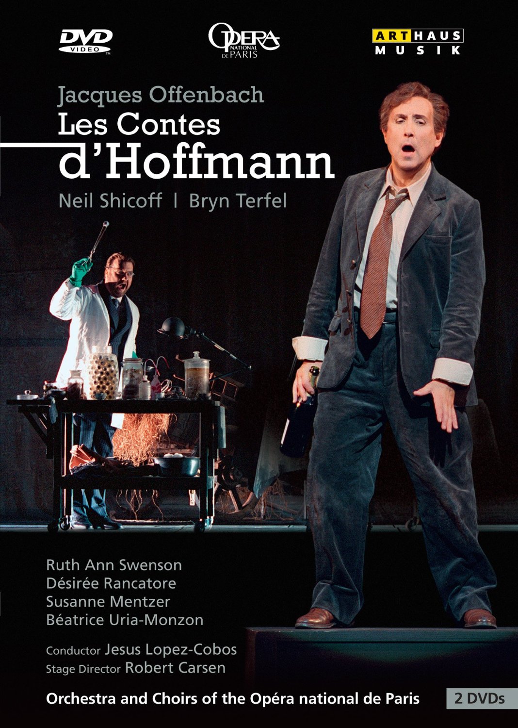 Marc Laho è un Hoffmann vocalmente generoso ma senza gli acuti di tradizione e soprattutto monocorde e inespressivo. Nelle quattro parti diaboliche Nicolas Cavallier è corretto ma manca completamente di carisma. Le tre parti femminili sono opportunamente assegnate a tre diverse cantanti tutte però fisicamente simili alla Stella: caschetto nero alla Louise Brooks (tanto che senza la musica parrebbe di trovarsi davandi alla Lulu di Berg), nuda Olympia, abbottonatissima Antonia, in guépière Giulietta. Ma anche qui, a parte l’Olympia di Patricia Petibon, che con l’abbassamento di mezzo tono previsto dalla versione Oeser svetta nelle sue precise agilità, né l’Antonia di Rachel Harnisch né la Giulietta di Maria Riccarda Wesseling convincono pienamente: la prima un po’ fredda, la seconda dal timbro sgradevole. Meglio la Musa/Nicklausse di Stella Doufexis. Efficaci Henri Huchet nelle parti buffe, Gilles Cachemaille come Crespel e Bernard Deletré, Schlemil.