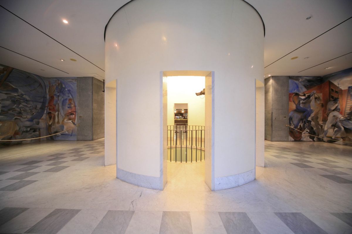 Raimondo Sirotti firma gli arazzi che irrompono con forza cromatica nell’algido foyer. Eseguiti dallo storico laboratorio Pinton di Aubusson gli arazzi riproducono una reinterpretazione contemporanea e suggestiva di due dipinti ora custoditi nel Museo dell’Accademia Ligustica di Belle Arti: La Pastorale del Grechetto e il Paradiso di Bernardo Strozzi .