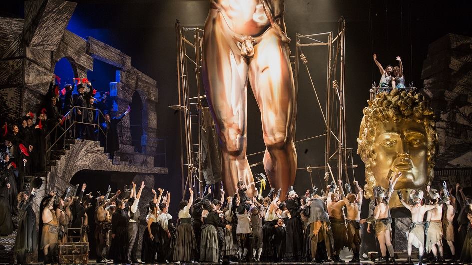 Lo spettacolo termina con i fuochi d’artificio della fusione della statua ma, ultimo tocco irriverente, la statua quando appare è così grande che ne vediamo solo la parte bassa, quella con le pudende in bella vista, mentre dal soffitto del teatro scende una pioggia di coriandoli dorati a riprodurre le scintille del processo di fusione. Standing ovation da parte di un pubblico del tutto soggiogato dallo spettacolo e dalla direzione partecipe ed entusiasmante di Sir Mark Elder alla guida della Filarmonica di Rotterdam.