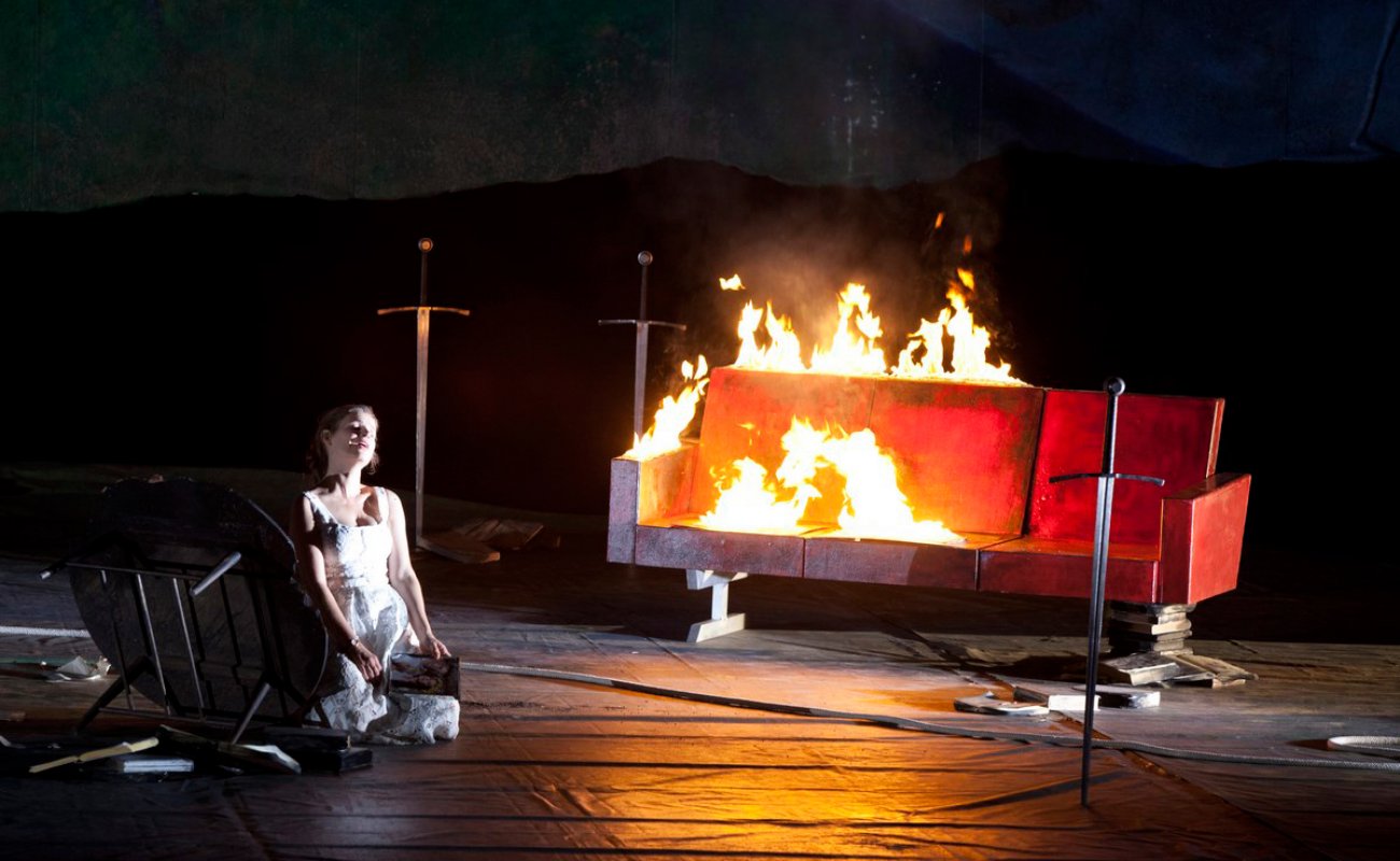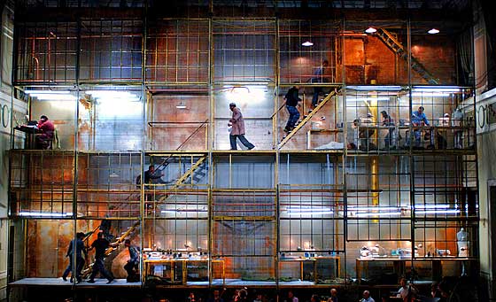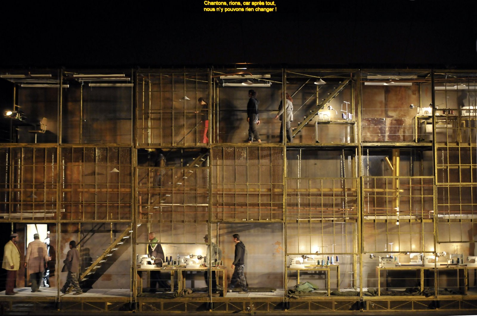 Per essere onesti sulla confezione sarebbe stato bene indicare che la rappresentazione è in forma semi-scenica: i cantanti hanno abiti che non fanno riferimento né al ruolo né al sesso dei personaggi, cantano perlopiù davanti a un leggio mentre il coro è in buca in abito da sera e con lo spartito in mano. I carrelli con tubi fluorescenti e fari che accecano gli spettatori e le inutili proiezioni con molta generosità si possono definire una scenografia. Il tutto è dettato dalle note vicissitudine economiche dell’ente fiorentino, ma allora perché ingaggiare ben cinque diverse persone (eccole: Marco Gandini, Valerio Tiberi, Italo Grassi, Simona Morresi, Virginio Levrio) per questa non-messa-in-scena? (3).