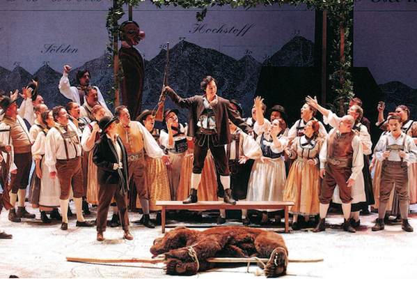 Con la speranza di una sua eventuale rivalutazione, al Grand Théâtre di Ginevra va in scena questo allestimento poco convinto di Cesare Lievi con la direzione di Evelino Pidò, non sempre seguito a dovere dall’orchestra della Suisse Romande. Un Tirolo da illustrazione per ragazzi quello dello scenografo Ezio Toffolutti: cime innevate dipinte sullo sfondo, alberi ritagliati come nei libri pop-up, marionette di legno, orsi di peluche, brache di cuoio per gli uomini e grembiuloni per le donne. Il ghiacciaio è reso con uno scivolo e un telo bianco, la valanga la solita nebbiolina di ghiaccio secco.