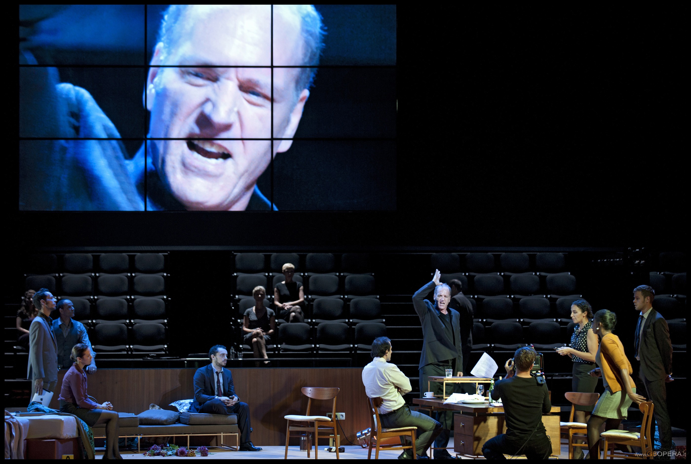 La regia di Alessio Pizzech spinge sul pedale del buffonesco convenzionale senza una particolare direzione attoriale, se non si vogliono intendere tali i gesti stereotipati dei cantanti. La scena unica ha colonne in stile orientaleggiante e sul fondo passano proiezioni di immagini a ruota libera (il Nudo seduto di Flandrin, le foto del Barone von Gloeden, la maschera di Fernand Khnopff, dettagli di cattedrali gotiche…). Alessio Pizzech firma anche la regia video senza risparmiarsi con effetti triti e ritriti: fermi immagine, sovrapposizioni, dissolvenze, immagini flou, tanto da trasformare la ripresa dello spettacolo in un datato video musicale, come se, insoddisfatto della propria regia teatrale, si volesse “rifare” con quella televisiva.