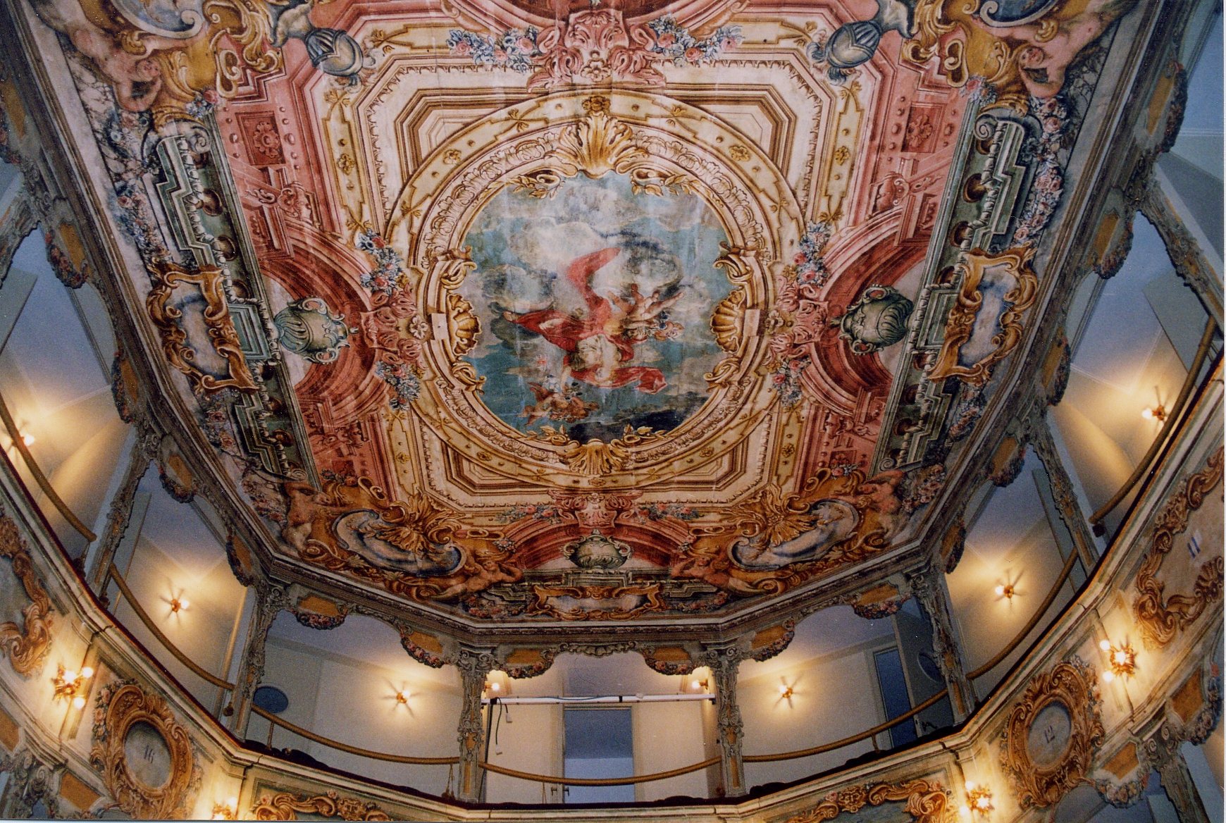 Una serie di esili colonne in legno di pianta esagonale e dipinte con un motivo a finto marmo, sorreggono, rinforzate da un’anima in acciaio, due ordini di palchi con balaustre lignee decorate da finte cornici e sormontate da festoni floreali. Al di sopra della sala il Liozzi, al centro di un complesso gioco di cornici e modanature, sfonda il soffitto ligneo, aprendolo su un cielo azzurro in cui campeggia la dea Flora.