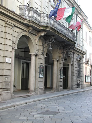 L’edificio che ospita il Teatro Gobetti venne costruito tra il 1840 e il 1842 ad opera dell’Accademia Filodrammatica, i cui soci desideravano dotarsi di una sede stabile per le loro rappresentazioni, fino a quel momento allestite nei salotti di palazzi privati. L’inaugurazione ebbe luogo il 21 gennaio 1842 alla presenza del principe Vittorio Emanuele II, con la rappresentazione di una tragedia di Carlo Marengo e di una commedia di Eugène Scribe. Del teatro ci resta una descrizione di Pietro Visetti, che racconta di come il piano terreno, riservato all’accoglienza, si aprisse con una «graziosa saletta ottagona appositamente costruita per servire da camera d’aspetto». Si passava poi ad un grande vestibolo di forma ellittica, da cui partiva una sontuosa scala che raggiungeva il piano superiore: qui si trovavano la sala per gli spettacoli e gli spazi di servizio. Il Visetti si sofferma sul «maestoso proscenio, sorretto da quattro colonne scanalate»; sul soffitto erano scolpiti alcuni cassettoni, oltre a «eleganti emblemi musicali rappresentati sui binari di fianco».