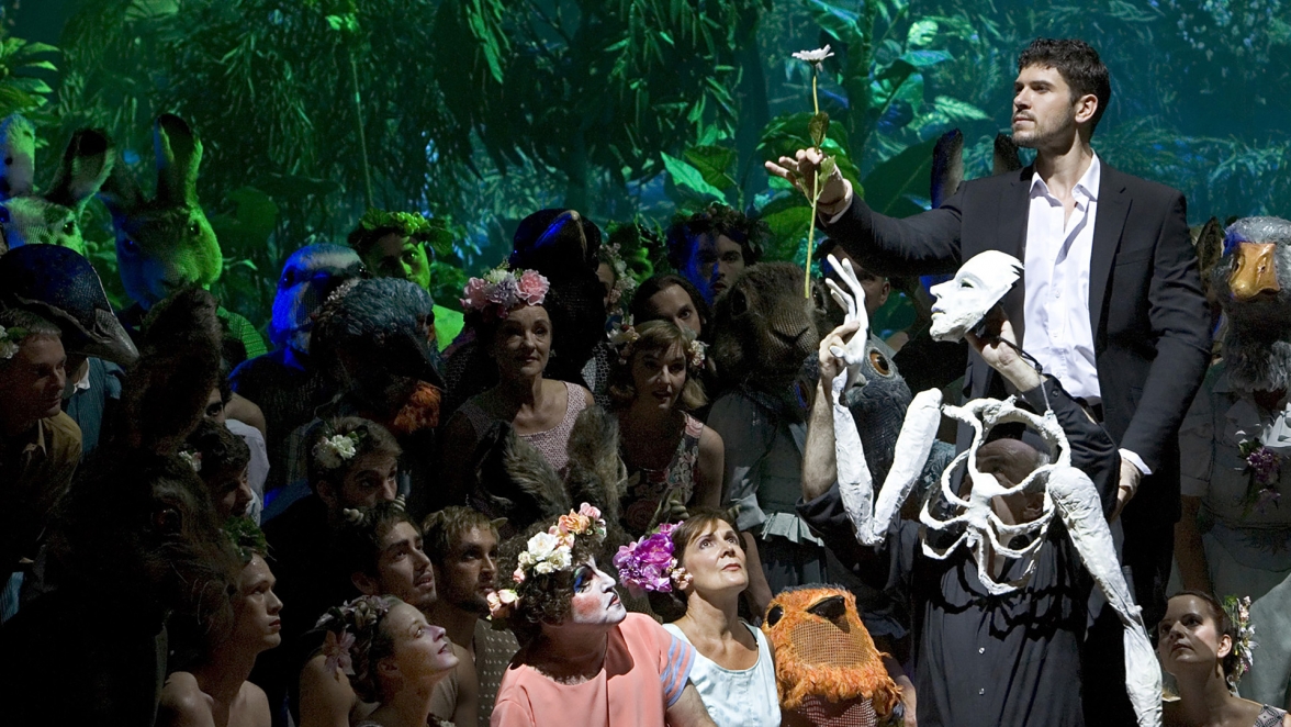 Non è certo un Orfeo per puristi questo di Kosky, né in orchestra né nel reparto vocale, ma è uno spettacolo incantevole che ricrea la “favola in musica” con mezzi moderni. Più simile a un musical che a una paludata esecuzione, di barocco ha comunque la ricchezza visiva. Alcuni momenti sono magici, come quando nella sala inondata di luce verde volano decine di uccellini appesi alle pertiche tenute dai coristi disseminati nelle gallerie o gli interventi del burattinaio. Il palcoscenico continua oltre la fossa orchestrale fino a occupare buona parte della platea così che il pubblico si trova a stretto contatto con i ballerini e i cantanti che animano la vicenda. La quale vicenda segue abbastanza fedelmente le linee tradizionali anche se la Musica qui è Amore e nel finale Orfeo, invece di salire in cielo assieme al padre Apollo, affoga nel piccolo stagno in cui Amore aveva varato barchette di carta prima dell’ingresso di Caronte.