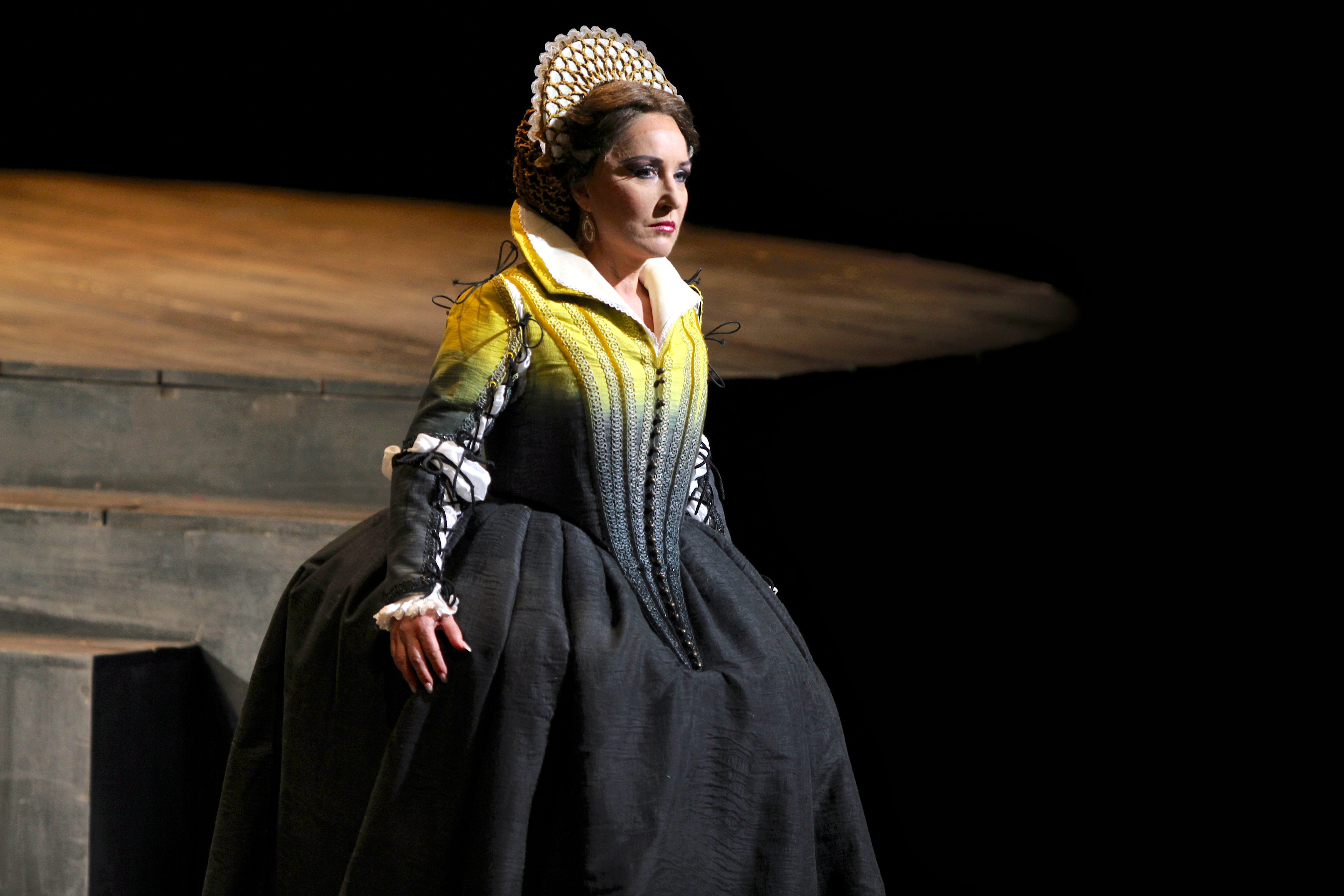 A sipario aperto appaiono le candide gorgiere e le nere palandrane del coro dei cortigiani; nera è la piattaforma e neri sono i pochi elementi scenografici in stile Tudor della scarna scenografia di Monica Manganelli. Soli accenti di colori sono gli abiti dei sei protagonisti, disegnati come sempre con sontuosa fantasia da Gianluca Falaschi. Preziosamente realizzati e giustamente voluminosi (con fatica si adattano allo stretto trono gotico!) quelli delle due regine, altrettanto volutamente eccessivi quelli degli uomini. Gli ampi gonnoni di Talbot, Cecil e Leicester danno a questi personaggi una figura “femminilizzata” e impacciata che mette in risalto la decisionalità e il temperamento delle due regine, gli unici personaggi “attivi” di questa vicenda, anche se quello di Roberto di Leicester, in raso celeste ricamato, è imposto a un cantante che già di suo dispone di una corporatura generosa. Impietoso diventa il contrasto tra l’elegante bozzetto riportato sul programma di sala e il risultato visto dal vivo.