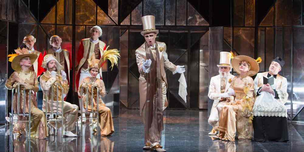 Il lavoro di Dobrzyński è un’opera buffa e come l’originale da cui deriva è in tre atti in cui si alternano brani parlati a numeri cantati. Lo stile atonale lucidamente ricreato da Przemysław Fiugajskie a capo dell’Opera Sinfonietta ha come modello il Naso di Šostakovič di cui riprende lo stile grottesco, già comunque presente nella pièce teatrale, ma la prosa allucinata e visionaria di Gombrowicz qui trova solo un pallido corrispettivo in questo allestimento dell’Opera da Camera di Varsavia al MuTh (Musik&Theater) di Vienna. Il regista Jerzy Lach porta al parossismo la differenza fra le due classi sociali preminenti, con l’aristocrazia costretta nei corsetti delle regole e delle norme, stretti come la loro apertura mentale. Lo stile dei loro abiti è pomposo come il loro parlare e stravagante come il ripetuto gestire. La recitazione, i ricchissimi costumi (il costumista non è citato nella locandina dello spettacolo) e la scenografia tutta specchi di Jerzy Rudzky compongono uno spettacolo comunque visivamente attraente. Omogenea la compagnia polacca formata da efficaci cantanti-attori.