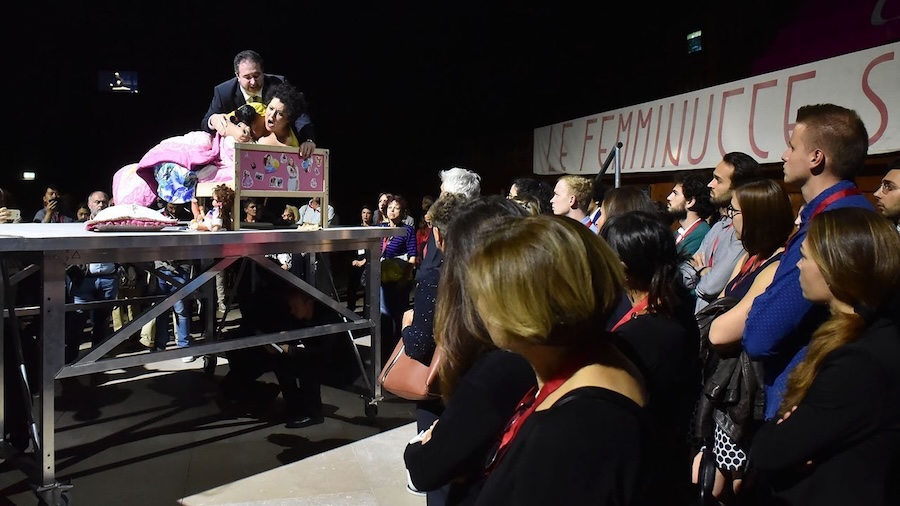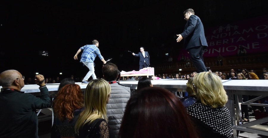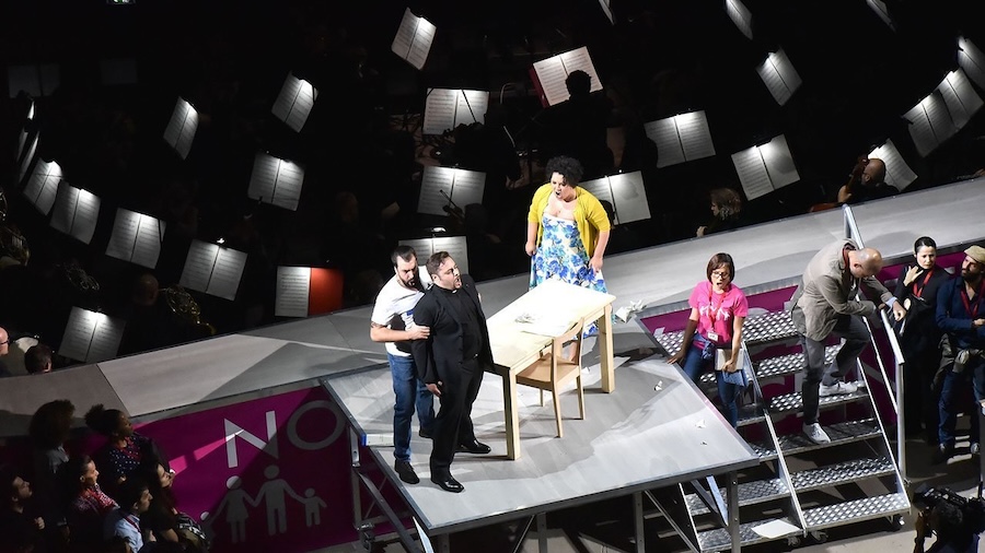 Per quest’opera, che precede la trilogia popolare e che anticipa nell’ambiente borghese la contemporaneità della Traviata, Vick sceglie l’attualità degli ipocriti Family Day e dei comitati “anti gender” a difesa della famiglia “tradizionale”: striscioni con «i maschietti sono maschietti» e «le femminucce sono femminucce» coprono le gradinate, i figuranti sono preti o militanti con una maglietta rosa avente l’immagine stilizzata della famiglia formata da mamma, papà, maschietto e femminuccia appunto, nei banchetti ci sono i moduli “contro il gender” (e mi dicono che qualcuno ha firmato!) mentre, perché sia ancora più chiaro il messaggio, due gay sono ferocemente pestati quando vengono scoperti. Solo alla fine, quando Stiffelio farà proprie le parole evangeliche del perdono dell’adultera, verrano ritirati gli striscioni e le contestate magliette: ora sì che il Vangelo viene messo in pratica.