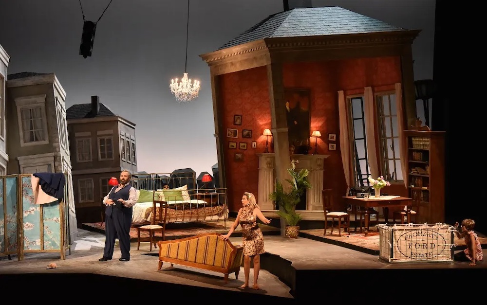 Nell’allestimento di Jacopo Spirei il sipario rappresenta una bandiera britannica probabilmente usata come tovaglia: macchie e segni dei bicchiere lasciati sulla sua superficie ci ricordano ironicamente la propensione al bere e al mangiare copiosamente del protagonista. Lo stesso sipario calerà ad ogni cambio di scena, purtroppo, con lunghi momenti di attesa che diluiscono il ritmo di questa «corsa folle verso la sua conclusione», come la definisce il regista. Appena Falstaff entra in scena il pavimento della sua camera alla taverna della Giarrettiera cede per il peso e questo elemento obliquo impronterà tutta la scenografia dell’opera, con case e strade sbilenche: una città squilibrata dalla presenza del personaggio che vede crollare il mondo al di fuori di sé. È questa la chiave di lettura scelta dal regista che punta poco sull’aspetto grottesco e umoristico della figura di Falstaff, per sottolineare invece il futile ambiente borghese che non sa far altro che inventare burle grossolane per riderne sgangheratamente, salvo poi alla fine scoprire di essere quello burlato.