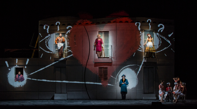 L’ambientazione mediterranea dell’opera è ricreata dal regista Giorgio Barberio Corsetti con il suo affascinante teatro-immagine in cui le proiezioni video e la realtà virtuale hanno grande rilevanza: durante l’ouverture vediamo la rossa decappottabile dei nobili inglesi immersa nei paesaggi che attraversano nel loro gran tour italiano e anche la prima scena del terzo atto con Fra Diavolo che passeggia lungo una strada di città è resa molto abilmente con proiezioni dinamiche.
