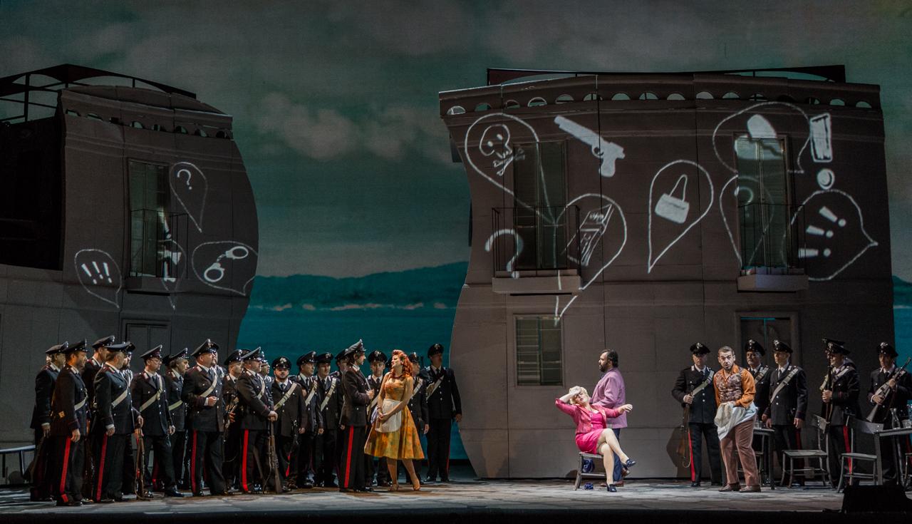 Nel foyer del teatro fa poi bella mostra di sé un ritratto tridimensionale così realizzato di John Osborn, il protagonista. Il tenore americano non si risparmia nella definizione di un ruolo a cui è affidata una vocalità impegnativa che risolve con grande facilità e con un’eleganza e una dizione francese che non sempre si ritrova negli altri interpreti. Con l’aria di un mafiosetto in completo blu, il duplice aspetto del brigante, quello seduttore e quello spietato, è reso con ironia e impeccabile resa vocale dal cantante, che controlla sempre con maestria i registri della voce piegata a caratterizzare le diverse sfaccettature del suo carattere, sebbene venga messo maggiormente in rilievo l’aspetto cinico del personaggio rispetto a quello seduttore.