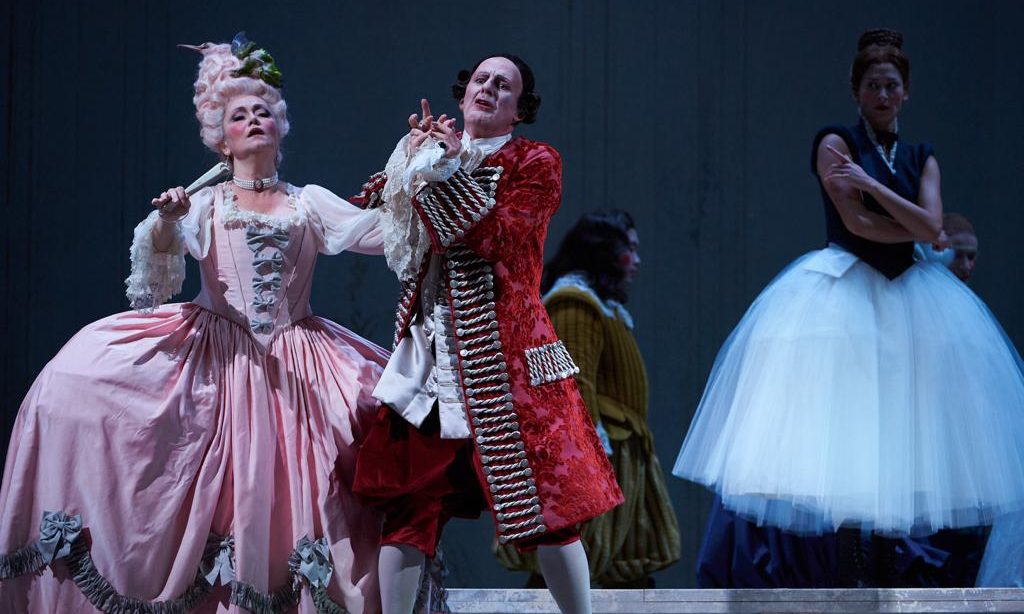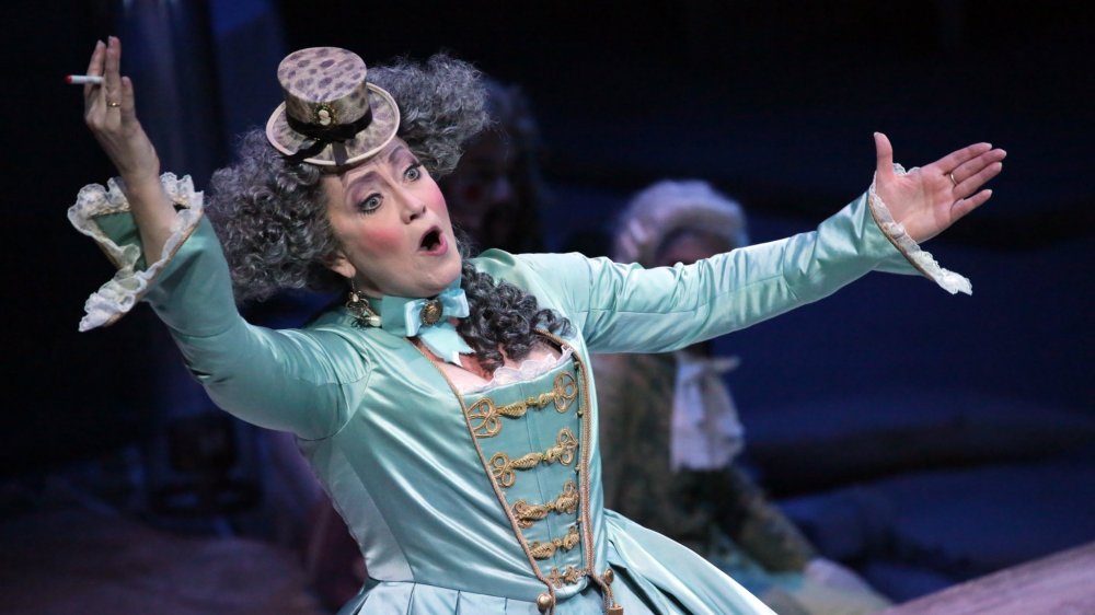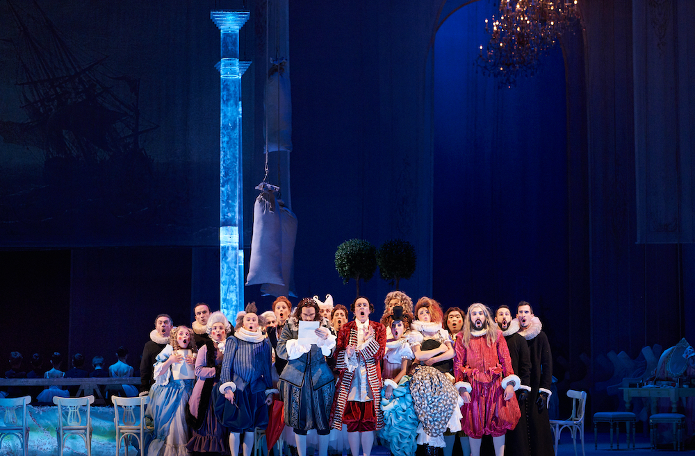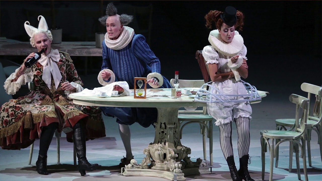 Alla magia della musica di Sciarrino si accompagna la magia dell’allestimento del regista tedesco Jürgen Flimm, qui adiuvato da Gudrum Harmann, e dalla poetica scenografia del grande George Tsypin: la scena è a più livelli con eterei teli dipinti che calano a delimitare l’area della prova e a fare da fondo alle esibizioni canore del soprano. Nella confusione della scena in allestimento si nota la presenza di personaggi strani o incongrui (una ballerina in tutù, una suora en travesti, clown, figure alla Callot…) che danno allo spettacolo un tono onirico e quasi felliniano con i bei costuni di Ursula Kudrna che spaziano liberamente tra Seicento e Settecento.