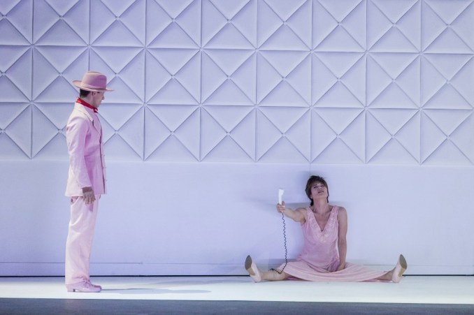 Con ragione la regista non ha proposto nessun aggancio narrativo tra i due lavori (1) e mette in scena due spettacoli completamente diversi, programmaticamente differenti, a cominciare dai colori dominanti delle scenografie di Carmine Maringola: bianco e rosa per la prima parte, tutto in nero per la seconda.