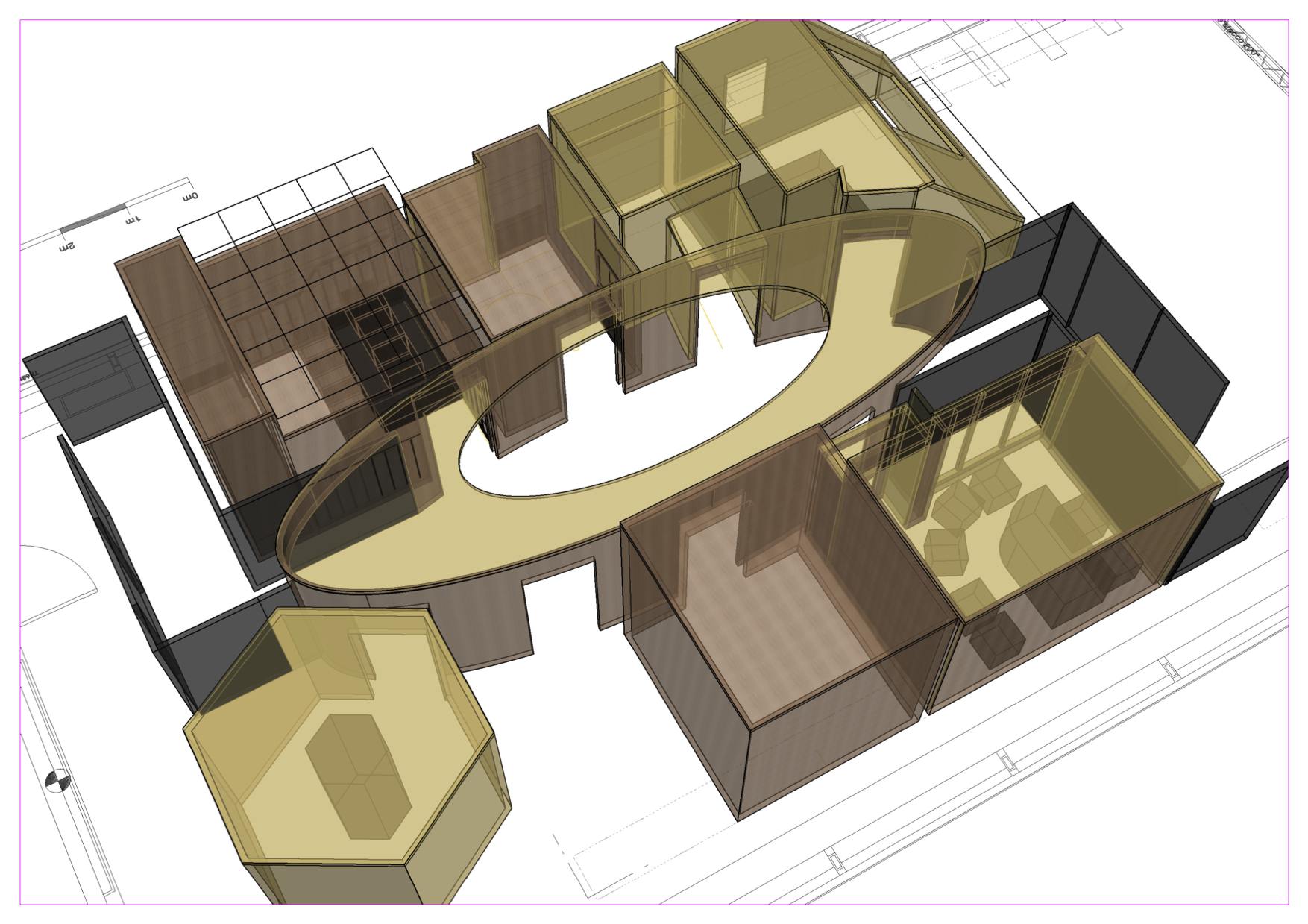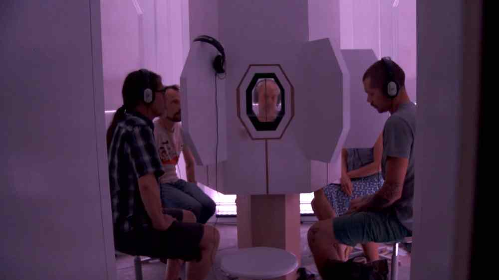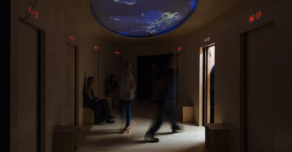 Una sala d’attesa ellittica con un planisfero sul soffitto che rappresenta il numero di morti in diretta sul nostro pianeta; otto porte che si aprono e si chiudono automaticamente dopo aver fatto entrare poche persone alla volta, testimoni del trapasso di altri esseri umani.