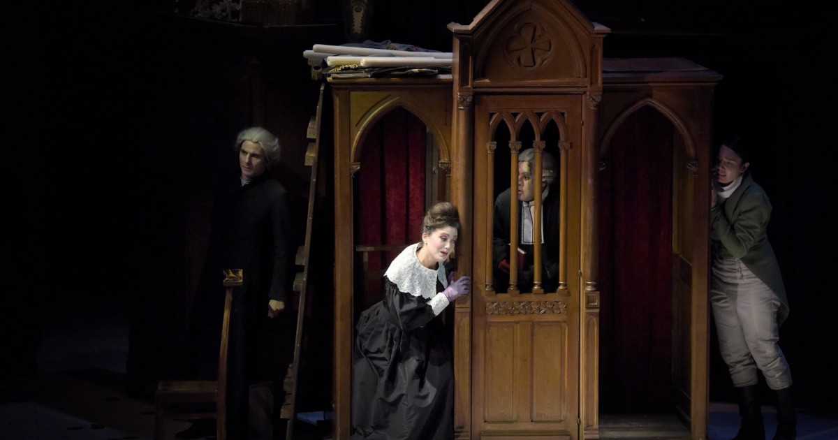 Irriverente e dissacratoria è l’ambientazione di Éric Ruf: mobili di chiesa accatastati, tra i quali un pulpito da cui il finto eremita, un abate rubicondo, dispensa le sue benedizioni, qui addirittura miracolose, e un confessionale senza fondo da cui, come dalle porte di una farsa di Feydeau, i personaggi entrano ed escono senza posa. Libera di suppellettili è invece la scena del secondo atto, l’interno rigorosamente ascetico di un castello la cui atmosfera puritana non aspetta altro che di essere animata da un branco di finte monache brille.