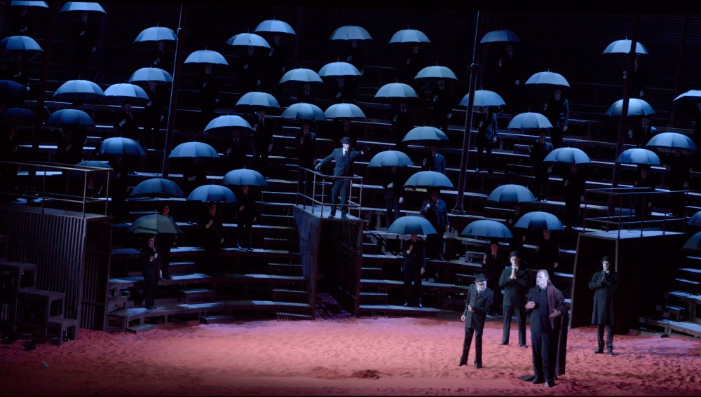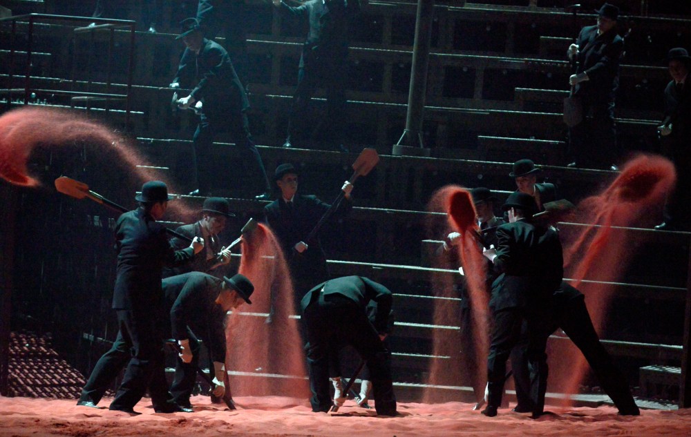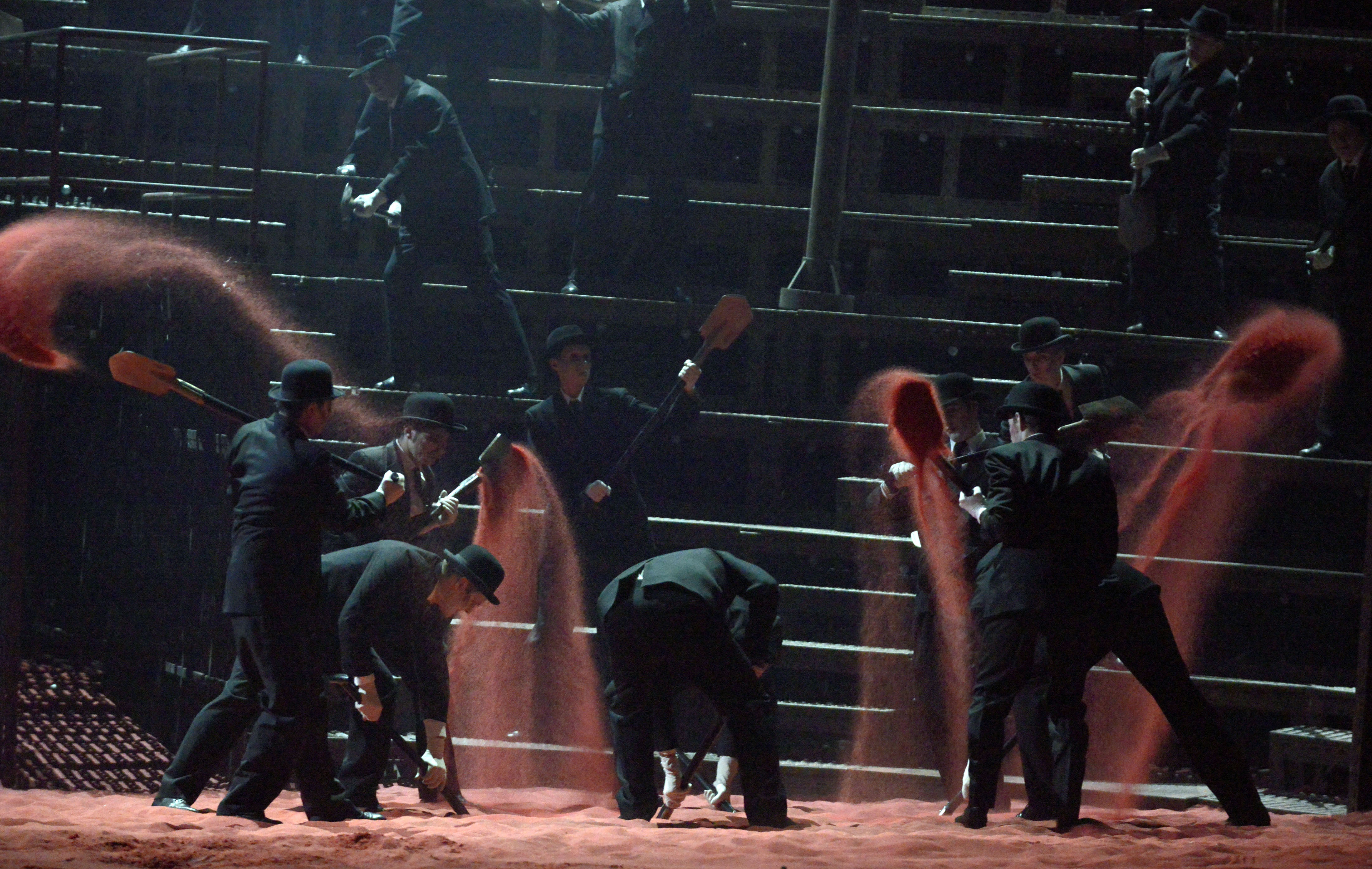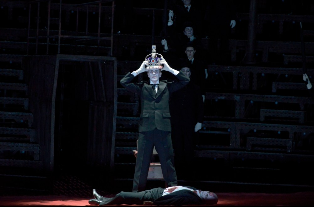 Il personaggio titolare nella regia di Carsen non esibisce una evidente deformità fisica, ma la utilizza a piacere come una marca di individualità e giustificazione per la sua mancanza di sentimenti. Quando i nobili si alleano con lui ognuno mimerà la sua supposta deformazione. Come nel teatro elisabettiano l’impianto scenografico di Radu Boruzescu è unico: un circo dalle gradinate leggermente sbilenche con una pista di sabbia rossa. Una corona scintillante di gemme passa da un capo all’altro in questo gioco crudele in cui tutti i maschi hanno lo stesso abito e cappello nero. Il viso truccato di bianco rende ancora meno individualizzati i vari personaggi, tutti quanti burattini comandati da uno psicopatico che è diventato leader senza un progetto di governo ma solo per soddisfare i suoi interessi e la sete di potere – archetipo dei moderni dittatori “democraticamente eletti” e quindi tragicamente attuale. Alla sua seconda collaborazione con Battistelli, dopo il precedente CO2 presentato alla Scala, Carsen muove con precisione i personaggi di questa cinica parabola con momenti degni di una drammaturgia della crudeltà. Gesti ottenuti con mezzi sobri ma altamente teatrali: la sabbia rossa sollevata che allude al sangue versato dai soldati delle due opposte fazioni nella stilizzata battaglia finale, l’utilizzo di ombrelli neri (come ne Les Boréades), i badili usati come armi, le carriole per trasportare morituri e morti.