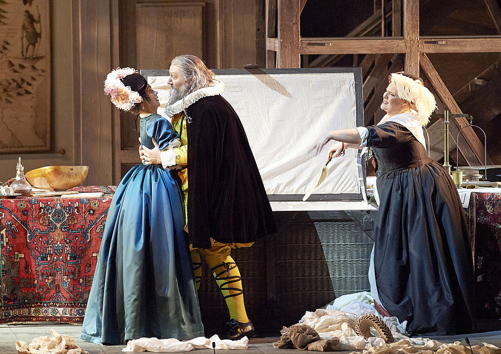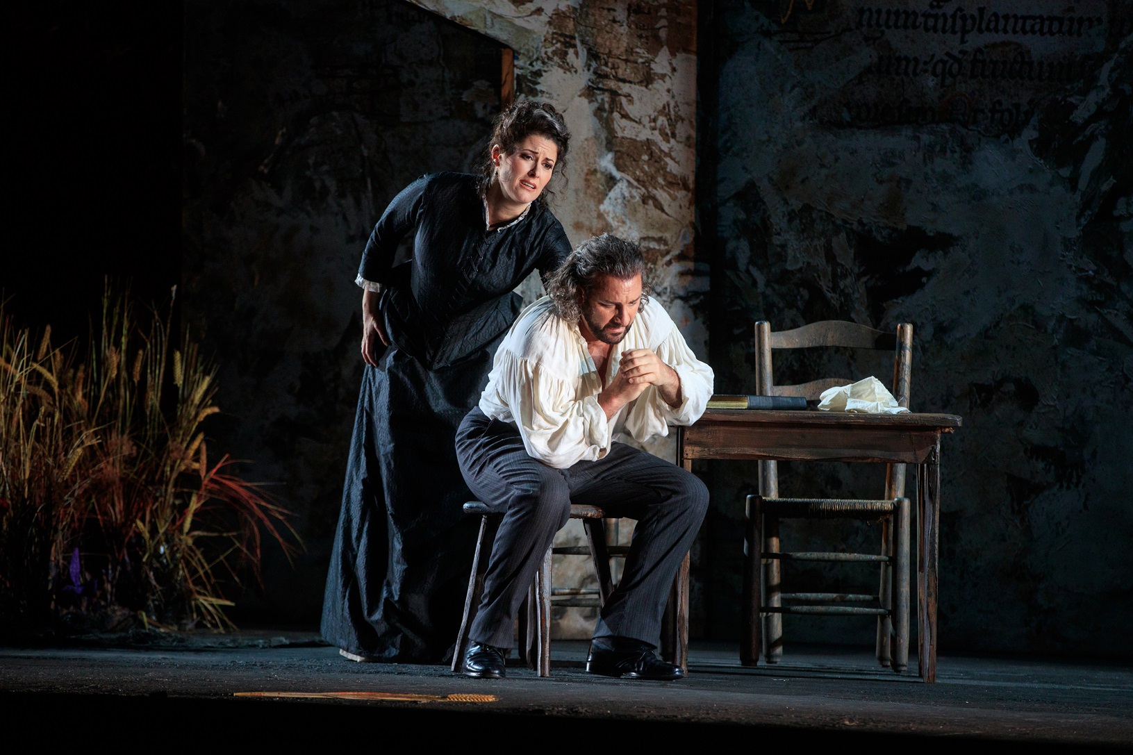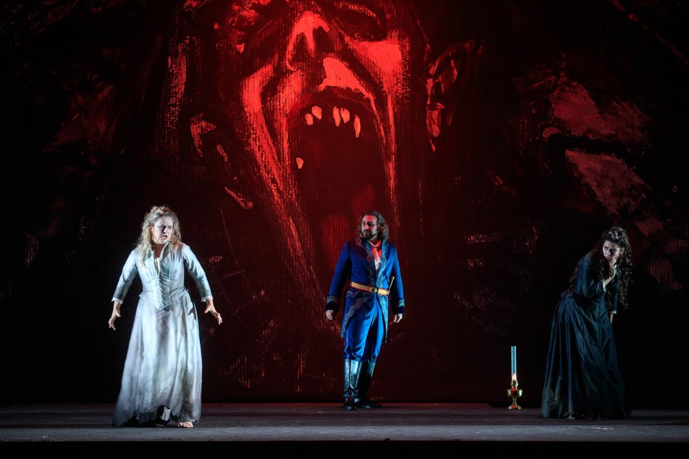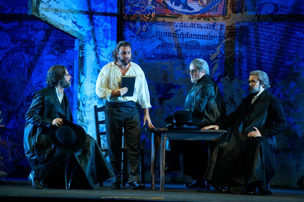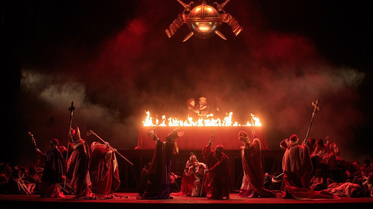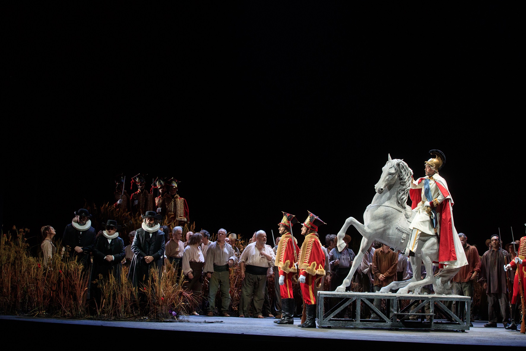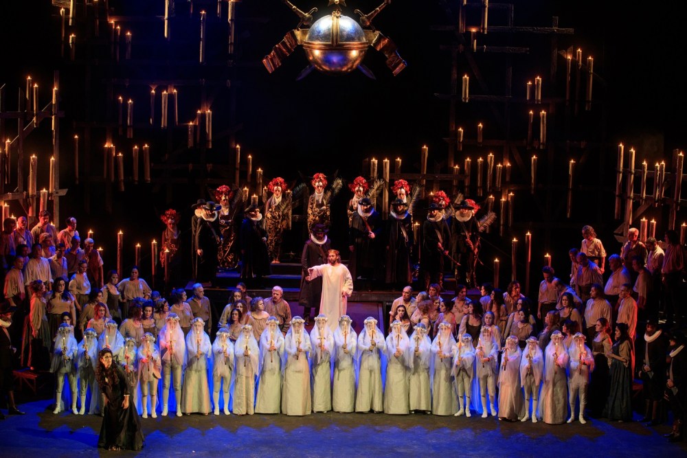 Nessun disaccordo invece sulla componente musicale. Claus Peter Flor alla testa dell’orchestra del teatro è giustamente teatralmente drammatico, ma non eccede con gli effetti ed è sempre rispettoso delle voci in scena. E quali voci! John Osborn riprende il ruolo lasciato da poco e non esistono passaggi di forza o acuti che lo mettano in difficoltà, pianissimi e colori si succedono con naturalezza ed eleganza nella sua memorabile interpretazione. Con Fidès si inaugurava la serie dei grandi mezzosoprani drammatici verdiani: Azucena, Eboli, Amneris. Qui Kate Aldrich, forse troppo giovane per essere la madre di Jean, sfodera un temperamento notevole e i registri con cui si sviluppa la sua vocalità vengono affrontati con grande facilità. La sua è una prova maiuscola. Anche la Berthe di Sofia Fomina si impone in scena con la purezza e la sicurezza di una voce di cristallo solido e luminoso. Il ruolo semiserio dei tre ipocriti anabattisti, che si ritroverà nei Ping, Pang e Pong della Turandot di Puccini, è affidato a un autorevole Dmitrij Ivaščenko (Zacharie), a Mikeldi Atxalandabaso (Jonas) e a Thomas Dear (Mathisen). Incerto tra il grottesco e il drammatico il Conte d’Oberthal di Leonardo Estévez, per di più con seri problemi di intonazione. Vocalmente pregevoli i cori impegnati incessantemente in questo grand opéra. Deludente la coreografia di Pierluigi Vanelli che risolve in maniera banale i ballabili dei pattinatori.