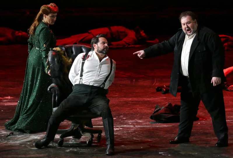 La messa in scena di Davide Livermore sfrutta abilmente vari mezzi espressivi: le scenografie monumentali e cupe di Giò Forma, il led wall del fondo su cui scorrono le nubi di un cielo minaccioso o le immagini di città orrendamente bombardate (eccellente come il solito il lavoro della D-Wok) , la ricostruzione come tableau vivant dell’incontro di papa Leone Magno con l’invasore Unno nell’affresco al Vaticano di Raffaello. Ma questo non è l’unico riferimento iconografico della sua produzione: perturbante è il banchetto del secondo atto ricostruito come ne La caduta degli dèi di Visconti, mentre prima le immagini dei civili uccisi avevano richiamato Roma città aperta di Rossellini e il grido muto della bambina fotogrammi di Ėjzenštejn. Come sempre nelle regie di Livermore la componente visiva cinematografica è al servizio della sua espressione con risultati mirabili. Il gioco luci di Antonio Castro e i costumi come al solito accuratissimi di Gianluca Falaschi compongono uno spettacolo splendidamente realizzato. A parte la trasposizione temporale, le idee registiche sono tutte fedelmente tradizionali e non hanno “turbato” il pubblico della prima milanese con ardite decodificazioni. Il risultato è stato un tribudio di applausi che hanno superato in lunghezza e intensità quelli delle recenti inaugurazioni scaligere.