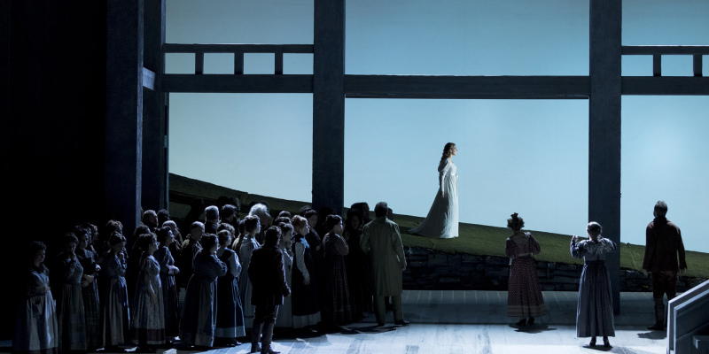 Non che ci si aspetti tanto nella messa in scena di questa delicata vicenda, ma la scelta di Mauro Avogadro sembra sia stata la rinuncia a qualsiasi presa di posizione. Il suo allestimento scivola via senza lasciare traccia e non si scorge neppure quanto dichiarato dal regista: «Amina soffre di una patologia, ha una mente alterata, ha dei disturbi relazionali: insomma, non è una persona equilibrata». Il pathos è lasciato fuori del teatro e Amina mette in apprensione i valligiani perché passeggia sul prato (!), mentre il suo ritrovamento nel letto del conte non ha nulla di teatrale. Peccato perché lo spettacolo non era iniziato male, con l’arrivo della carrozza del conte – va be’ i cavalli di cui «odesi il calpestio» non ci sono e la carrozza è tirata a mano – ma poi sembra che il regista si sia preso una vacanza. Non aiuta neppure la scenografia, bruttoccia, di Giacomo Andrico, quasi una scena fissa che si adatta a rappresentare la piazza del villaggio tirolese, la stanza del conte (che qui ha l’intimità di una stazione ferroviaria) e l’«ombrosa valletta».