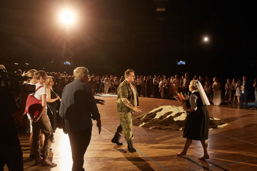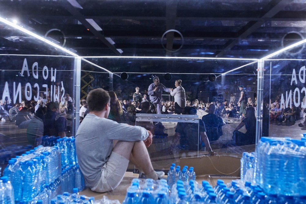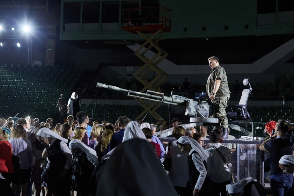 150 anni dopo quella sfortunata prima, una produzione molto particolare viene messa in scena da Graham Vick che riprende l’idea del suo Stiffelio per coinvolgere direttamente il pubblico in questa tragedia dell’intolleranza e dell’odio classista. Nel palazzetto dello sport di Poznań gli interpreti si confondono con gli spettatori in piedi occupando gli spazi lasciati vuoti da un pubblico inizialmente stupito, ma ben presto partecipe. Dei giovani con un cartello appeso al collo (attrice, ateo, folle, femminista, emarginato, eretico, secchione…, caratteristiche che ci rendono diversi, rifiutati, strani per gli altri) attendono in piedi su una sedia gli spettatori. In gabbie di vetro, che vengono usate come pedane semoventi, altri giovani eseguono umili lavori. Le sacerdotesse sono suore con un secchio in testa con acqua che versano in una vasca che fa le veci del fiume Gange. Dopo il duetto tra Idamor e Neala entrano in solenne processione i brahmini, ognuno con la sua aureola di led. Particolarmente riuscita è la regia della festa di nozze con le danze nell’acqua coreografate da Ron Howell. Come nello Stiffelio Vick sceglie questo modo di rappresentazione per esaltare il messaggio di denuncia verso il potere religioso e l’intolleranza verso i diversi, temi che sono sempre attuali. E forse è proprio solo in questa maniera che può essere ripreso un titolo desueto come questo.