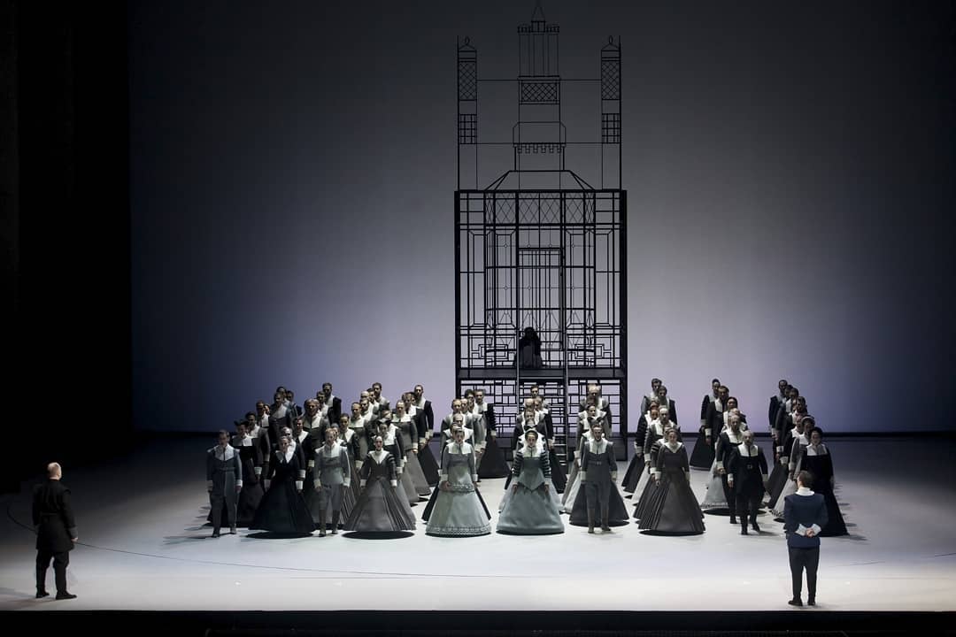 Riccardo Frizza ha l’arduo compito di adattare quest’opera essenzialmente intimista alle dimensioni colossali della sala. L’equilibrio della buca con le voci in scena lo porta ad allungare i tempi e a perdere di pathos nella lettura, con dolorosi tagli, della partitura che risulta corretta ma non trascinante e con un’orchestra a volte un po’ pesante. Elsa Dreisig è un’Elvira di eccellente presenza scenica, il timbro è luminoso e aperto, mai metallico. La dolcezza dei legati e delle mezze voci si affianca agli acuti precisi seppure un po’ secchi, ma è l’evoluzione del personaggio, che cresce passando dal fatuo «Son vergin vezzosa» del primo atto alla scena della pazzia del secondo alla “guarigione” nel terzo, il maggior merito del soprano franco-danese. In alternanza a Javier Camarena, il secondo Arturo del cast è quello di Francesco Demuro, non pienamente soddisfacente per una voce che non conosce molte sfumature e arriva agli acuti assottigliandosi, con una linea vocale non sempre omogenea e un timbro un po’ nasale. Diversi e complementari i due baritoni: Nicolas Testé è un Giorgio paterno e nobile che utilizza in maniera sapiente un volume di voce non enorme, Igor Golovatenko delinea invece un Riccardo fiero e vigoroso con una voce proiettata e aperta. Su un livello inferiore si sono dimostrati gli altri interpreti. Il coro, trattato in maniera grafica, quasi pedine di una scacchiera con le donne che si muovono a passettini sotto le ampie gonne e sembrano scivolare sulla superficie e con la ridicola coreografia delle alabarde dei maschi, ha dato prova di compattezza vocale sotto la cura di José Luis Basso.