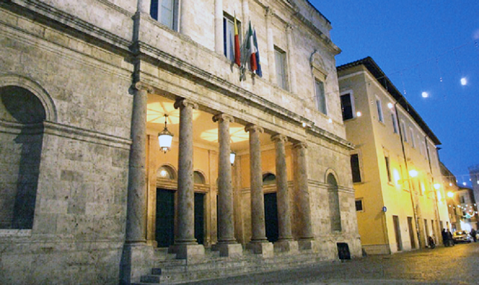La facciata neoclassica, in travertino rifinito, presenta un colonnato centrale composto da sei colonne ioniche in pietra, aggiunte da Gabriele Gabrielli nel 1851, che formano un pronao, su cui s’aprono tre porte che accedono all’atrio arricchito da nicchie e statue opera di Giorgio ed Emidio Paci e un soffitto a cassettoni in stucco. Al secondo piano, due finestre archivoltate e lunettate sono in corrispondenza delle due lunette del piano terra; al centro, su un colonnato d’ordine corinzio, tamponato, fanno bella mostra tre luci neoclassiche. Una seconda trabeazione, su cui si leva un timpano triangolare di coronamento, completa l’elegante ma austera costruzione. Al piano superiore c’è il foyer, impreziosito da decorazioni con stucchi. Questi sono stati realizzati in oro da Giorgio ed Emidio Paci, su disegno dell’architetto Giambattista Carducci. Altre decorazioni come il sipario raffigurante Il trionfo di Ventidio Basso sui Parti, i quadri di mezzo, le muse, le medaglie furono opera dell’anconetano Vincenzo Podesti. I volti degli affreschi di Pietro Carbonari di Jesi ed il soffitto fu dipinto da Ferdinando Cicconi. I meccanismi del palcoscenico furono curati da Gabriele Ferretti di Ancona.