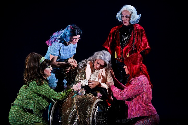 Da un’idea di Francesco Micheli e su un testo di Claire Dowie, le Nina’s Drag Queens, finalmente a Torino, dirigono e interpretano la vicenda del padre (qui una madre) che nella sua cieca follia non riconosce l’amore vero della figlia Cordelia e affida la sua vita invece alle altre due ingrate. La vicenda è fedele al plot originale con gli stessi personaggi, anche se il fool qui è una marionetta e Kent è la fedele dama di compagnia che si ripresenta come Clara (e l’omonimia con la cantante Clara Kent è ironicamente cercata). Lea Rossi (Lea R. dice l’insegna del suo negozio) è ossessionata dalle bambole e avviata alla demenza senile: il tema della vecchiaia è infatti l’oggetto di questa irriverente lettura che a momenti di sarcastico umorismo accosta amare riflessioni sulla senescenza, la malattia, la morte. L’attualità è invece presente nel personaggio di Edmund, qui immigrato badante nella casa di riposo. Con gli ineffabili versi di famose canzonette cantati dal vivo sulle musiche di Enrico Melozzi, lo spettacolo si sorregge sull’eccezionale bravura dei cinque interpreti: Alessio Calciolari, Gianluca di Lauro, Lorenzo Piccolo, Ulisse Romanò e il sempre sorprendente Sax Nicosia, vecchia Lea dalle mille sfaccettature. Ancora due serate.