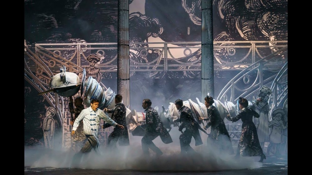 Se Suzanne Andrade e Barrie Kosky avevano puntato sul cinema muto espressionista e Simon McBurney su disegni fatti dal vivo, qui a dominare sono le scenografie bidimensionali, illustrazioni a penna e inchiostro di un Gustave Doré fin-de-siècle. L’ambientazione in un hotel Belle Époque dà modo di ricreare i personaggi come figure ironicamente tratteggiate: Sarastro è lo chef, lo Sprecher il sommelier, i Templari gli aiuto cuochi, la Regina della Notte un’esigente cliente, le tre dame le governanti e i Genietti tre bellboy. Gli armigeri e il serpente iniziale sono costruiti con utensili di cucina e le prove sostenute da Pamina sono quelle ai fornelli dei televisivi “Bake-off”. Naturalmente i grembiuli solennemente conquistati alla fine non sono quelli di Maestro Massone, ma di Master Chef…