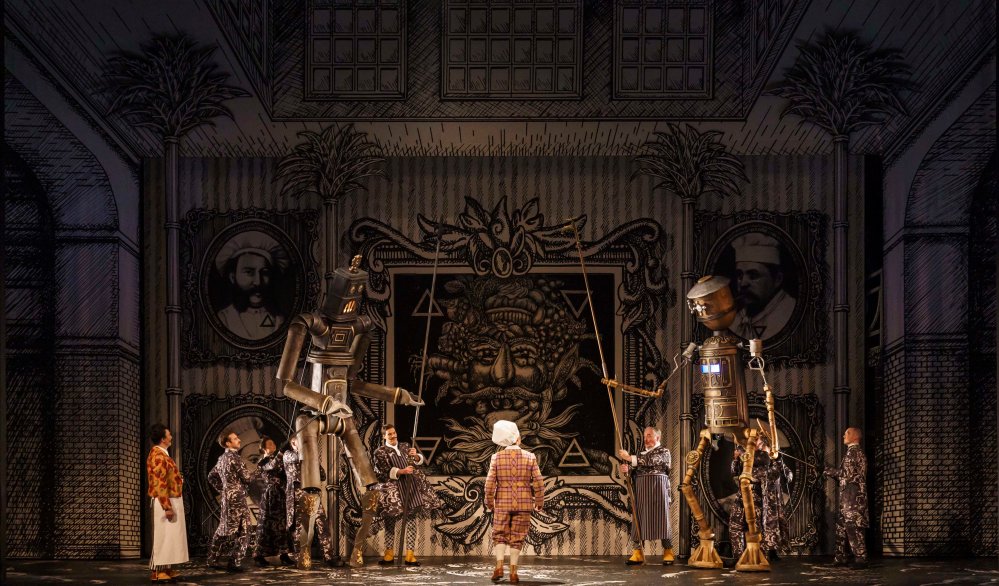 Se Suzanne Andrade e Barrie Kosky avevano puntato sul cinema muto espressionista e Simon McBurney su disegni fatti dal vivo, qui a dominare sono le scenografie bidimensionali, illustrazioni a penna e inchiostro di un Gustave Doré fin-de-siècle. L’ambientazione in un hotel Belle Époque dà modo di ricreare i personaggi come figure ironicamente tratteggiate: Sarastro è lo chef, lo Sprecher il sommelier, i Templari gli aiuto cuochi, la Regina della Notte un’esigente cliente, le tre dame le governanti e i Genietti tre bellboy. Gli armigeri e il serpente iniziale sono costruiti con utensili di cucina e le prove sostenute da Pamina sono quelle ai fornelli dei televisivi “Bake-off”. Naturalmente i grembiuli solennemente conquistati alla fine non sono quelli di Maestro Massone, ma di Master Chef…