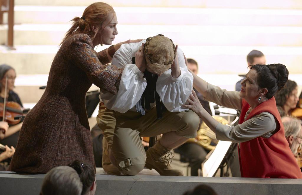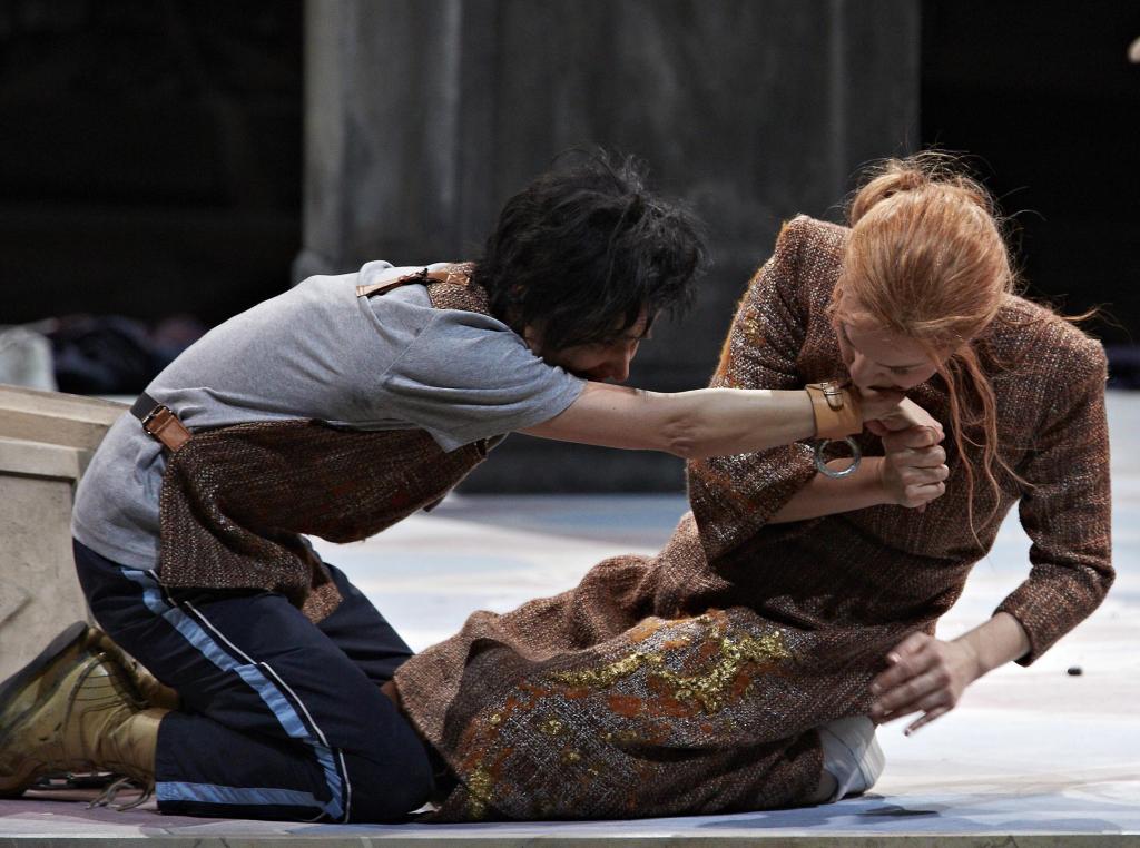 La scenografia di Anna Viebrock richiama un panorama purtroppo comune di certe città mediorientali: rovine classiche in primo piano (una scalinata, colonne, quasi una scena del Veronese o del Tintoretto, di cui in seguito si vedranno alcuni elementi pittorici) inserite in uno spazio urbano trasandato e che per di più porta i segni di una guerra in corso. Durante l’ouverture vediamo infatti delle persone in abiti moderni che cercano rifugio tra le colonne. Poi una ad una raccolgono da terra dei costumi dell’epoca (della composizione) e inizia l’azione. Il finale vedrà l’inverso: tutti si spoglieranno dei costumi per riprendere i loro vestiti e ritornare nella “tragica normalità” del presente.
