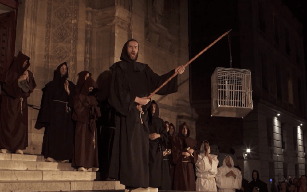Così fa il pubblico, che per la quarta scena, “l’addio di Lucifero” (60 minuti), si sposta nella chiesa vicina di Saint-Jacques Saint-Christophe dove lo aspetta un coro maschile di 39 elementi (13 tenori in saio bianco e 26 bassi in scuro), 7 tromboni e un organo per un impressionante rituale di esorcismo. Dal perimetro della navata centrale i coristi accerchiano il pubblico con i loro gesti, il frastuono degli zoccoli ai piedi e le note cavernose dei bassi del Coro dell’Esercito. Il continuo sonoro comprende il testo delle Lodi alle virtù di San Francesco: