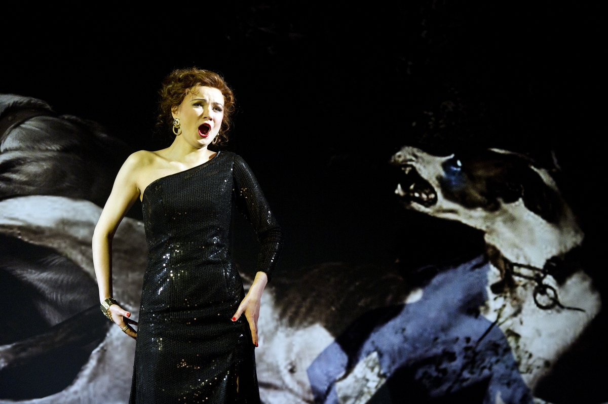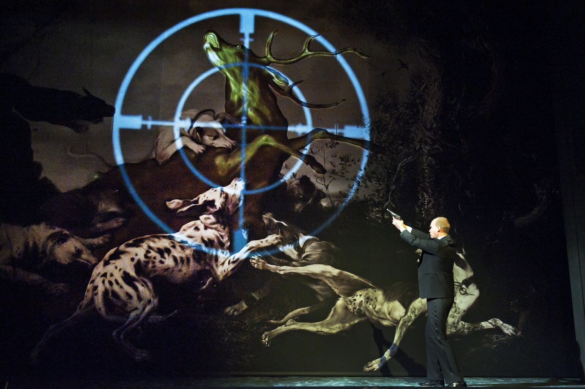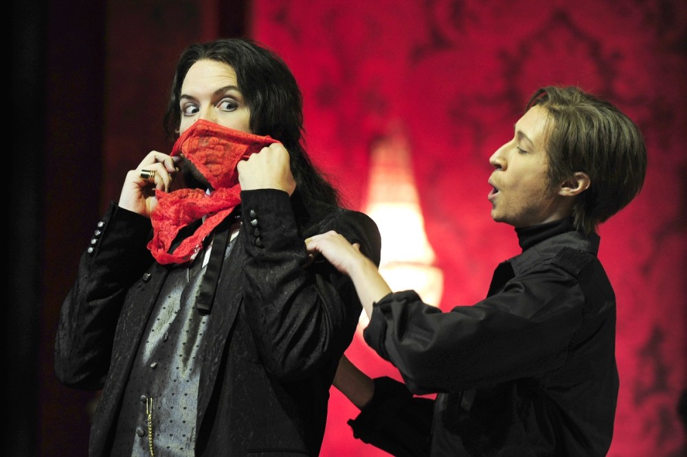 Nella scenografia di Gary McCann, quel che sembra un lussuoso casinò con porte segrete tagliate nelle pareti volgarmente damascate, tavoli da gioco e slot machine, contrasta con squallidi vicoli di esterni industriali. I costumi dello stesso McCann sono adeguati: Gustavo, il proprietario della bisca, sfoggia uno smoking con giacca bianca, le donne abiti da sera in lamé e tacchi a spillo, Gernando un cappottone di pelliccia da oligarca dell’est, Faramondo una tuta da militare.