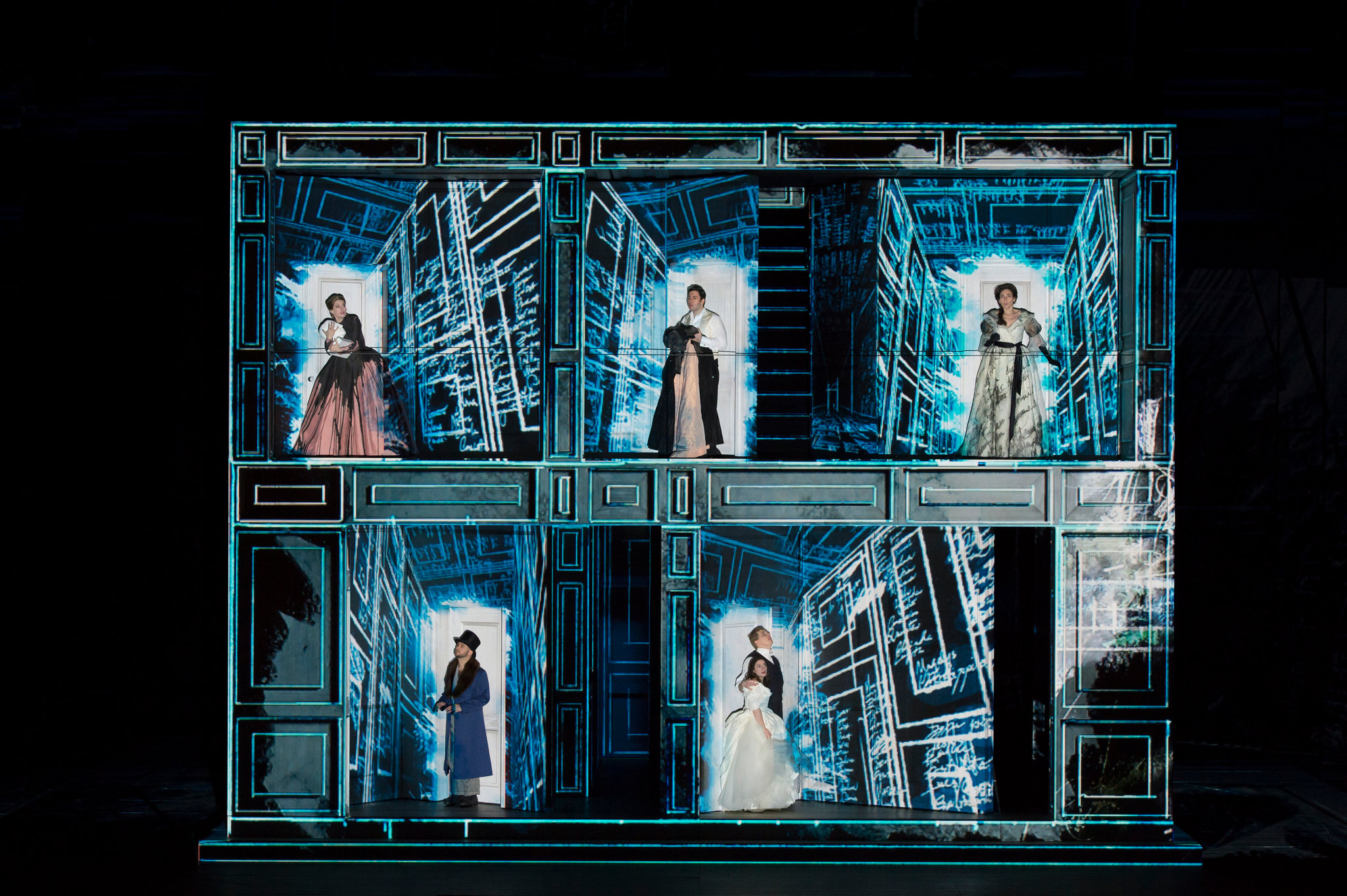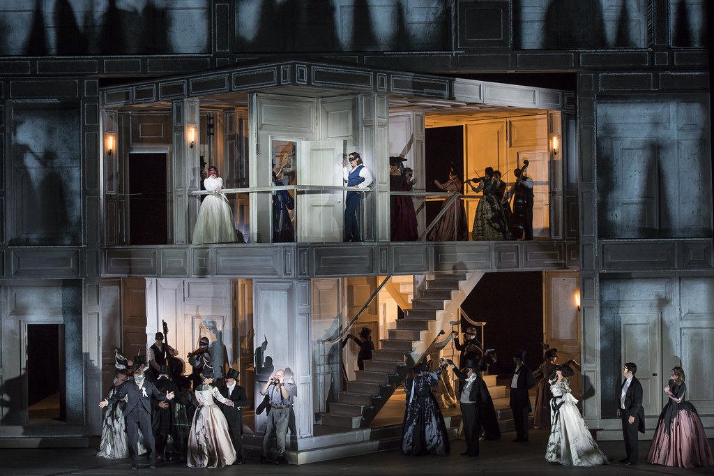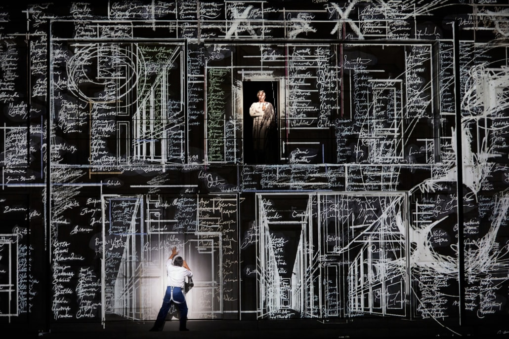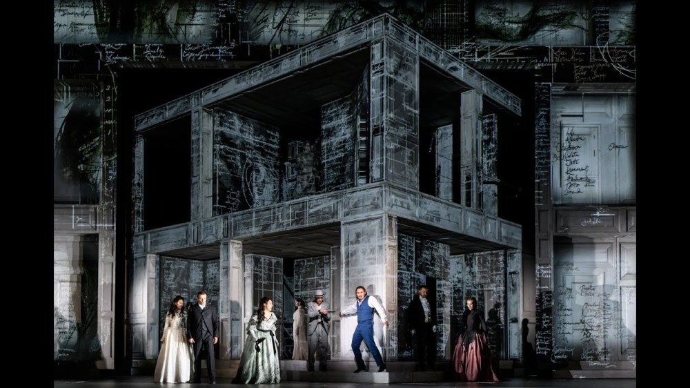 Fin dall’ouverture, diretta con mano leggera e ritmo perfetto da Nicola Luisotti, che suonerà con arguzia e maestria il fortepiano nei recitativi, con quell’elenco di nomi femminili scritti dalla magia dell’arte digitale sulla struttura architettonica in scena – quasi labirinto tridimensionale escheriano o cubo di Rubrik che ruota su sé stesso, ma anche modello della mente del protagonista – si capisce che l’allestimento non sarà dei più tradizionali, ma gli elementi della vicenda ci saranno tutti. La geniale scenografia è di quella maga di Es Devlin.