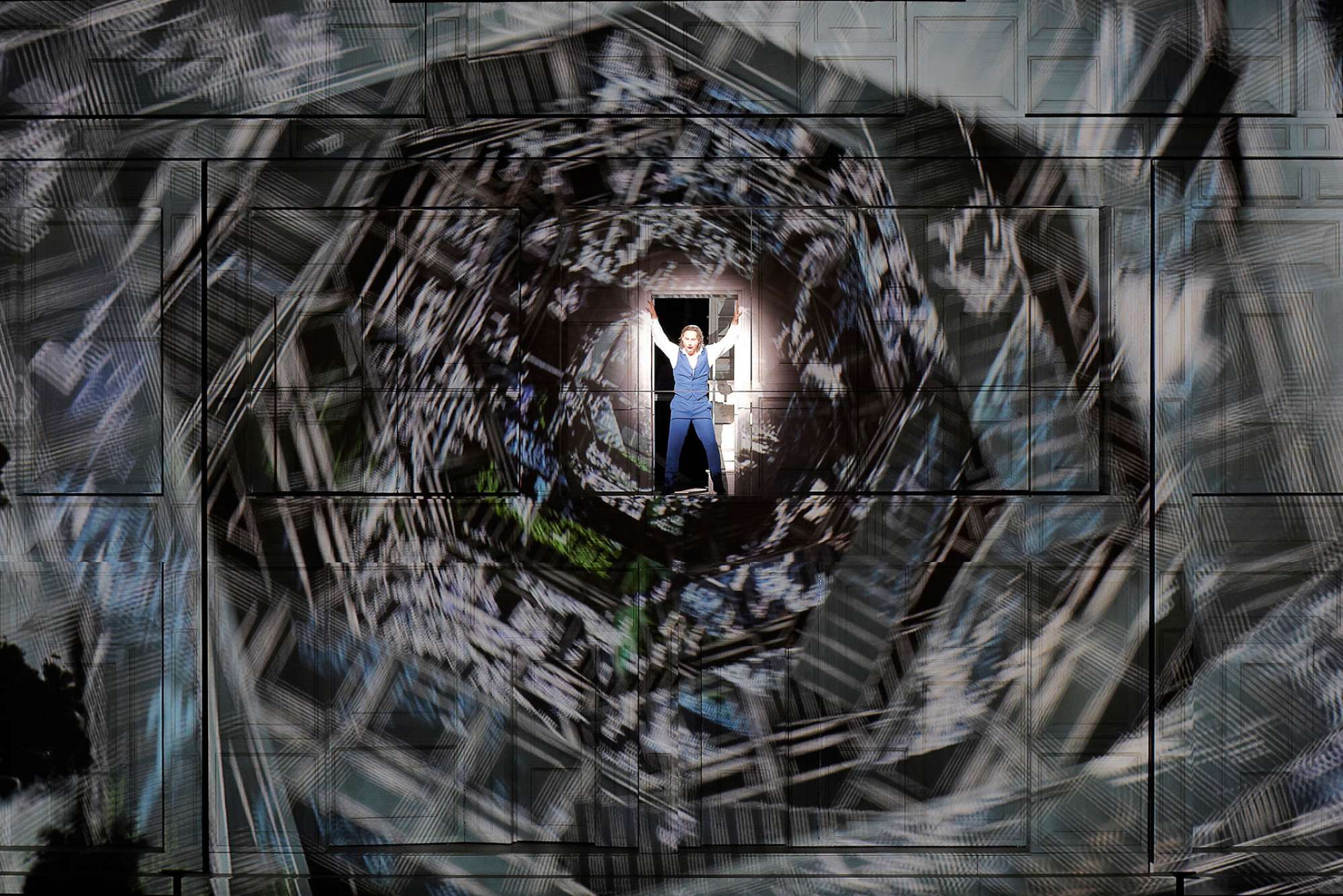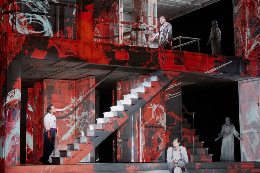 L’uso delle proiezioni digitali, realizzate in 3D mapping da Luke Halls, raggiunge qui livelli di vera fantasmagoria con effetti squisitamente cinematografici (Hitchcock è l’evidente riferimento). Riescono a rendere invisibili i personaggi o a cambiare il colore dell’abito, come quando Don Giovanni spaccia Leporello per sé stesso. (1)