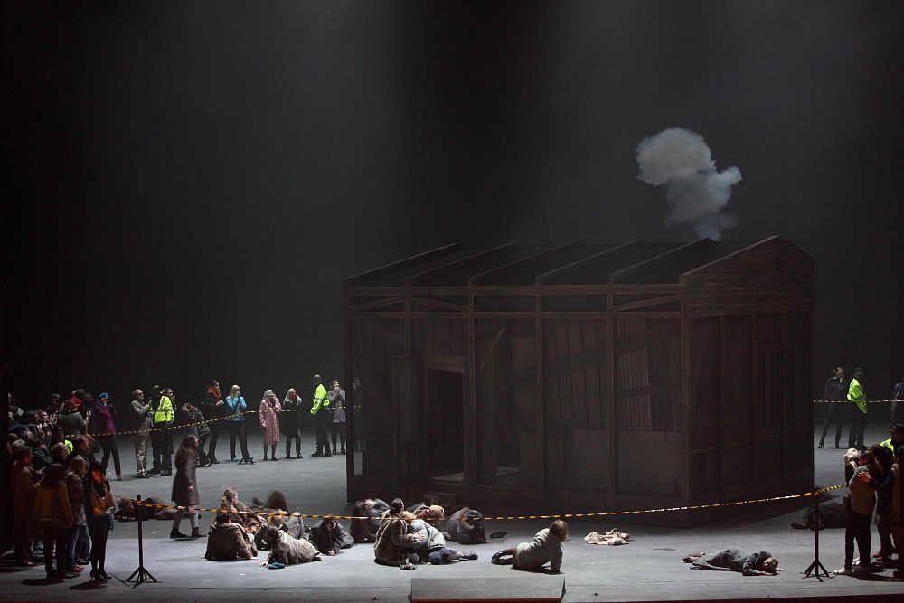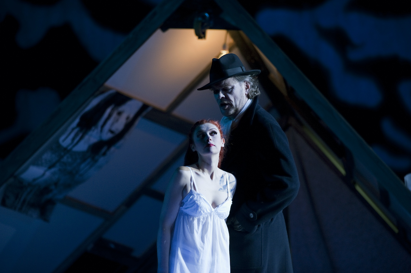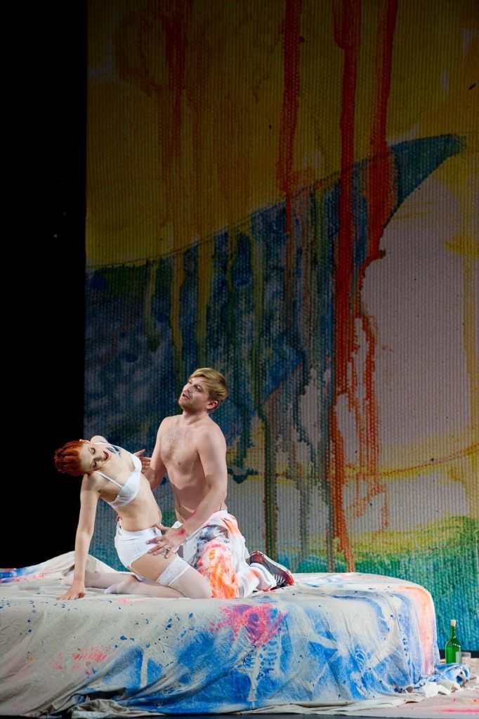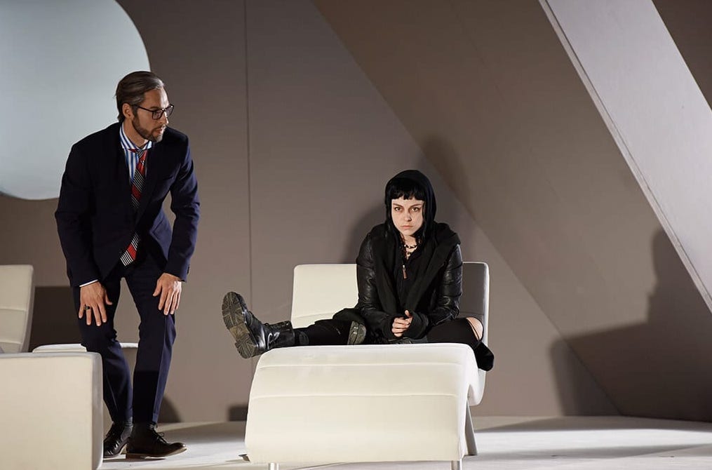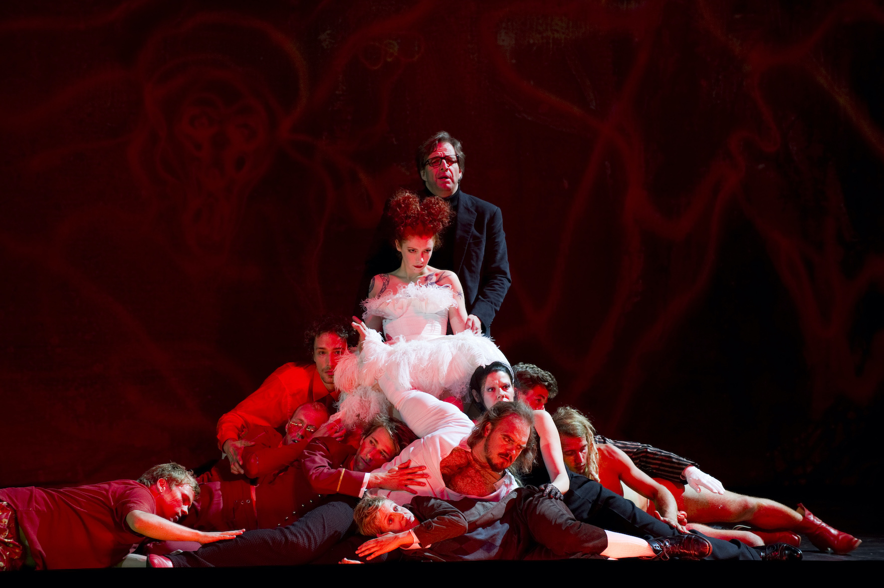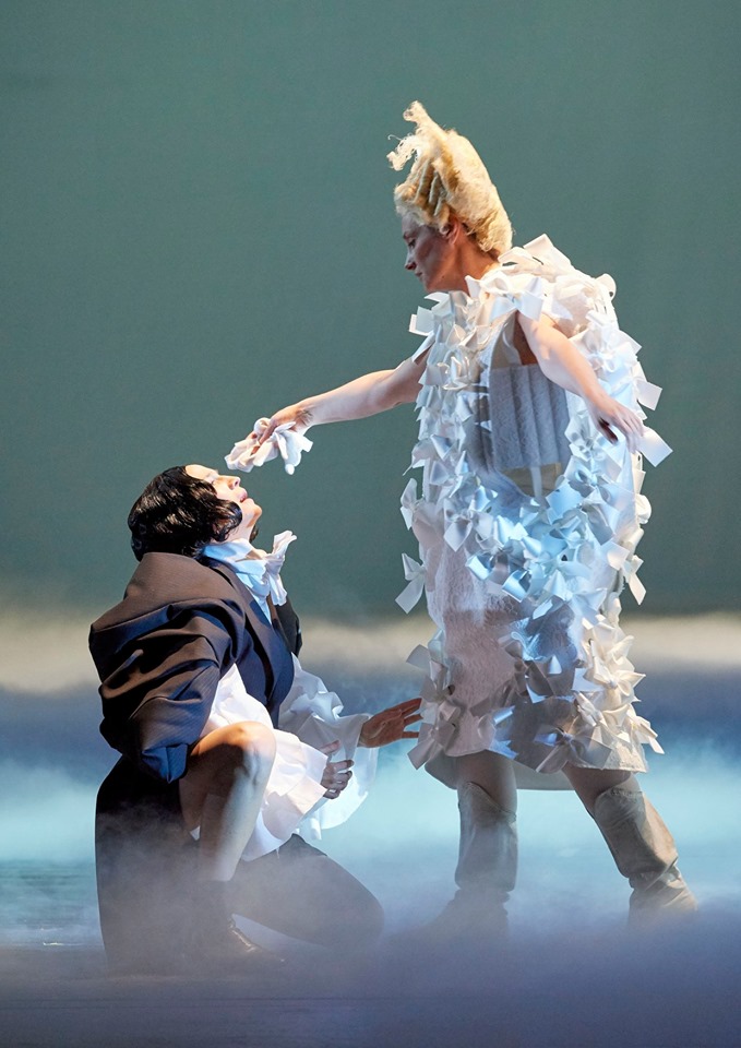 Garry Walker alla guida dell’orchestra del teatro concerta il canto declamato un po’ uniforme su cui si basa la vocalità, finché nel primo interludio, con la figura di Nutria, nella texture dissonante dell’orchestra si inserisce un elemento melodico tonale che accompagna la fluida leggerezza delle figure su ghiaccio disegnate dalla brava pattinatrice. Da quel momento l’orchestra diventa più seducente e orecchiabile fino a mimare la musica pop della festa in discoteca, il karaoke del patetico vecchietto e il momento di elegia del finale. Ogni quadro ha un suo proprio colore: al primo atto c’è grande spazio per gli archi, il secondo è più scuro con le voci del sassofono e dei legni bassi, nel terzo dominano gli ottoni.