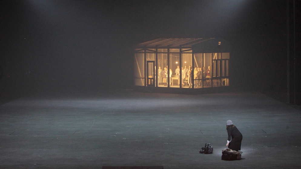 Quella registrata e trasmessa in streaming è la prova generale fatta al pomeriggio con la luce naturale, quindi poco si può dire del disegno luci . La regia di Stewart Laing si adatta alla particolarità del teatro con le sue grandi vetrate aperte sul verde esterno. Semplicissima la scenografia: una tenda a strisce sul fondo, una cabina di plexiglas su ruote (l’ufficio comunale di Enric, quello di Remo nel campeggio, una stanza d’albergo, il parlatorio del carcere), sedie di plastica e casse di legno. E soprattutto un liscio pavimento di materiale sintetico bianco su cui piroetta la nostra Alice Poggio.