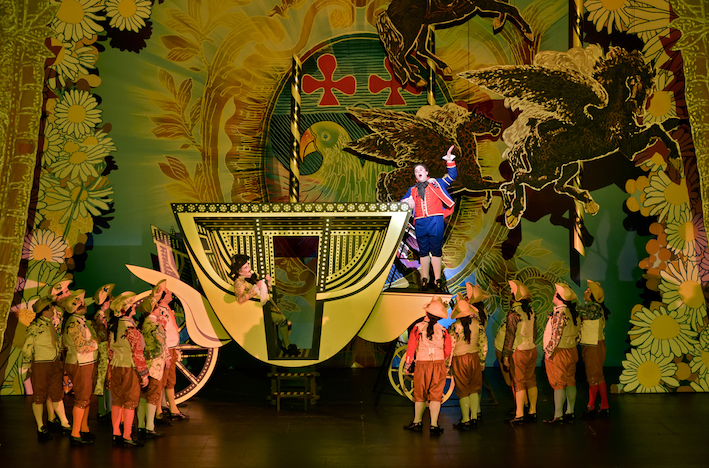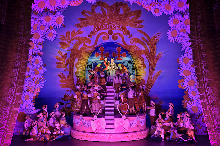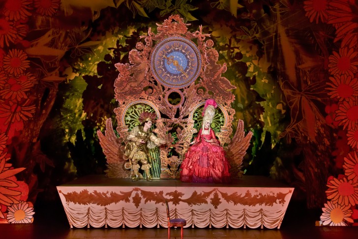 La sua messa in scena deve tener conto di questa dimensione burlesca e lo comprende bene e lo realizza altrettanto bene il regista Miche Fau, che, per di più, si ritaglia l’esilarante parte parlata di Rose, la femme de chambre di Madame de Latour, in crinolina rosa e smisurata parrucca bionda. Nella scenografia di Emmanuel Charles la scena è senza profondità, come la vicenda: un profluvio di fondali decorati in tinte acide e con pochi elementi stilizzati – la torta nuziale, la carrozza, il letto, un albero – che scendono dall’alto per sottolineare ancora di più la scelta anti-naturalistica in favore di quella favolistica. Se poi i coloratissimi costumi sono disegnati da Christian Lacroix si è certi di una loro ricchezza ed eleganza coniugate ironicamente.