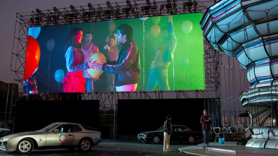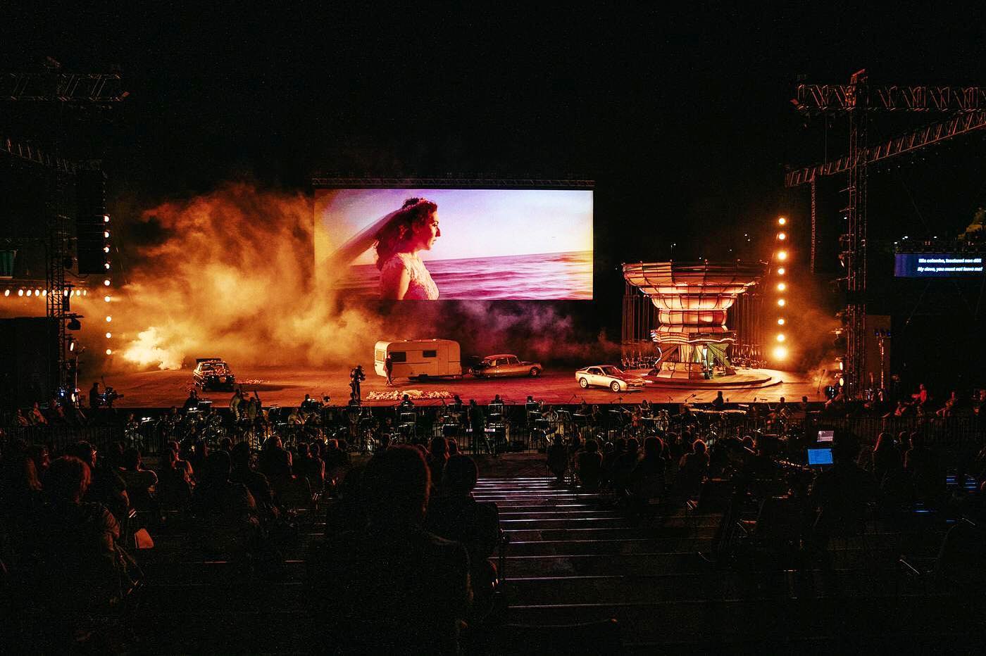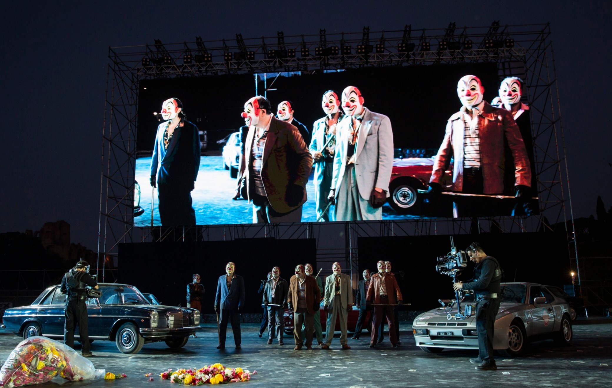La sfida di Michieletto è su più fronti: oltre a creare una drammaturgia efficace per un lavoro fatto spesso oggetto di una pratica di routine, il regista veneziano doveva rispettare gli stringenti dettati del distanziamento anti Covid-19. Il Circo Massimo ospita quindi solo 1500 spettatori, un decimo di quelli che potrebbe contenere, gli orchestrali sono anche loro debitamente distanziati e il palcoscenico con i suoi 40 m per 20 m permette di far agire in sicurezza i cantanti e i figuranti mentre il coro è nascosto in buca (in realtà l’orchestra è al livello del pavimento). Nella scenografia, come al solito ingegnosa di Paolo Fantin e  illuminata dal gioco luci di Alessandro Carletti, vediamo un triste luna park di periferia con una giostra (vera), un disordinato parcheggio con sei automobili e sul fondo un grande schermo, quasi da cinema drive-in. Le macchine servono genialmente a far rispettare le distanze: «Tutte le limitazioni imposte dalla pandemia sono state rispettate. Però questo non è uno spettacolo rinunciatario», ha affermato il regista. Le auto sono anche capsule che isolano i personaggi psicologicamente: Rigoletto è chiuso nella sua automobile, la faccia tumefatta probabilmente per uno sgarro compiuto, la bocca deformata dal dolore, lo sguardo abbrutito di un servitore del potere mafioso, ma anche padre che rivive la tragica beffa che gli ha ucciso la figlia. L’uomo esce dall’auto e fruga nel bagagliaio della vettura buttando all’aria i fiori che conteneva e spargendoli per terra. Alcuni sono sporchi di sangue. Con questa memorabile immagine inizia uno spettacolo avvincente e di grande tensione drammatica.