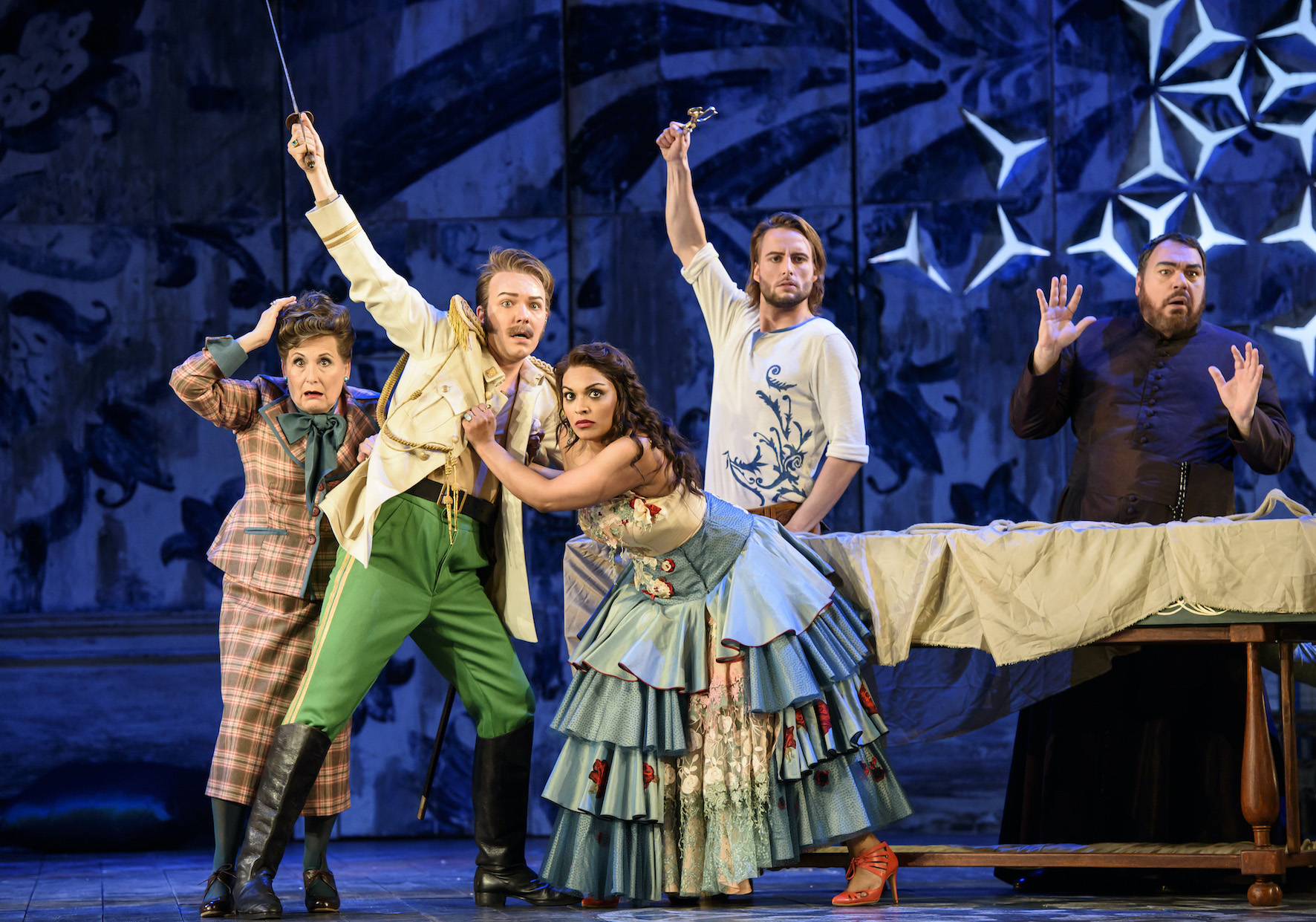 Rossini non è tra gli autori più eseguiti al Festival di Glyndebourne: l’ultima volta in cui fu messa in scena la sua opera più popolare fu trent’anni fa. Ora Il barbiere di Siviglia torna nell’allestimento di Annabel Arden che punta a un concentrato di Spagna nella scenografia (pareti con azulejos moreschi in bianco e azzurro) e nei costumi di Joanna Parker che suggeriscono gli anni 1950.