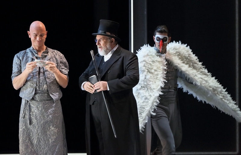 Nessuna particolare sottigliezza nella lettura della attrice-regista inglese che punta a una comicità farsesca, l’unica conosciuta al pubblico d’oltralpe quando si tratta del compositore pesarese. Ecco quindi scenette e controscenette, inserti parlati, tre figuranti acrobati onnipresenti e il pubblico ride a crepapelle. L’arrivo di un clavicembalo imballato prima e di vari altri che scendono dall’alto nel finale primo apporto un pizzico di surrealismo che ritroviamo anche dopo: i timori di Rosina per il matrimonio con Don Bartolo si concretizzano nella visione di una sposa velata e di uno sposo cornuto durante la musica del temporale.