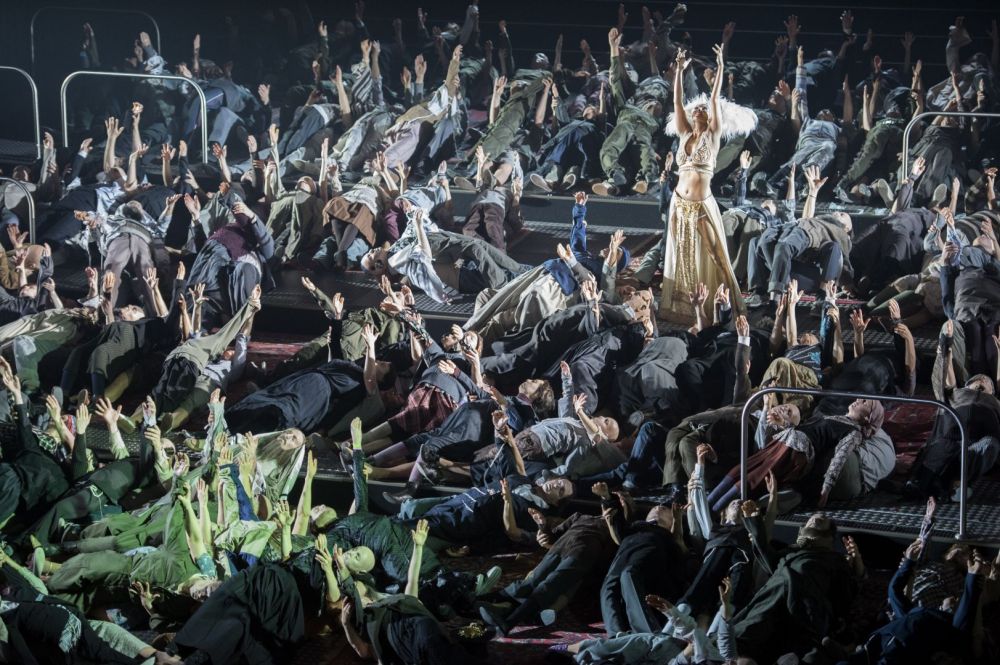 Una scelta coraggiosa quella di Graham Vick e della sua Birmingham Opera Company di riesumare un lavoro non tra i più esaltanti del ‘900, ma la sua messa in scena vince ogni perplessità e rende coinvolgente una storia debolmente trattata sulla carta. Coinvolgendo centinaia di volontari, il regista ambienta la vicenda in un magazzino periferico trasformato nella sala d’arrivi di un aeroporto. Un tabellone pubblicitario messo per terra è uno dei tanti palcoscenici – quasi lastre di ghiaccio galleggianti – su cui si sviluppa la vicenda. Attorno, il pubblico in piedi si mescola con interpreti, coristi e figuranti. Su una tribuna la Birmingham Symphony Orchestra diretta da Andrew Gourlay offre la sua colonna sonora di riff alle chitarre elettriche e alle percussioni, di scure armonie e di inquietanti interventi dei legni.