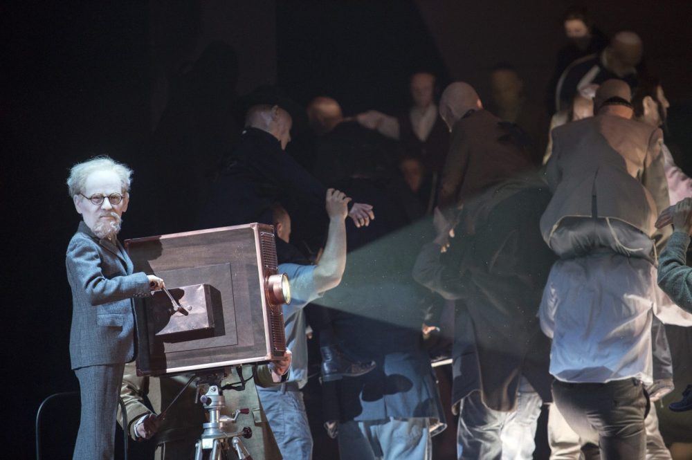 Nel 70° anniversario della liberazione di Auschwitz, lo spettacolo di Kosky non può prescindere dalle tremende immagini che conosciamo dell’Olocausto, ma le elabora in termini teatrali estremamente efficaci: a un certo punto il coro sembra raddoppiarsi quando ogni corista manovra un pupazzo in scala umana con le fattezze, sovente stereotipate, di un ebreo tradizionale. I pupazzi dopo aver partecipato alla “danza” vengono smembrati e gettati in un mucchio mentre prima pupazzi di bambini venivano sbattuti con la testa contro il muro. Dei figuranti con le maschere di Herzl, Freud (l’autore di Mosè e il monoteismo!), Marx, Schönberg stesso si erano avvicendati dietro una vecchia macchina da presa cinematografica che aveva reso la scena del vitello d’oro un balletto da operetta anni ’20. La sarcastica lettura di Kosky trasforma i due personaggi biblici in prestigiatori: cappello a cilindro, camicia con le ruches e papillon: mentre il Mosè di Schönberg è guidato dalla Pura Idea che viene dall’incontrare la Voce del Roveto Ardente e non riesce a trasmetterla perché la sua lingua non è “flessibile”, «Meine Zunge ist ungelenk: ich kann denken, aber nicht reden» (1) – come può persuadere masse schiavizzate di qualcosa che Mosè, balbettante nella Bibbia, chiama «invisibile e onnipresente» – Aron invece può comunicare l’idea liricamente, con il canto, le immagini, le meraviglie le lusinghe ed è anche un abile manipolatore di immagini, simboli e parole. I “miracoli” del bastone che si trasforma in serpe, della mano infettata dalla lebbra che si risana, dell’acqua che si tramuta in sangue e viceversa, sono trucchetti da prestigiatore, grazie a Mosè “spalla”, che incantano – e convincono – la folla. Quella stessa folla che ammira la danzatrice con le piume durante l’orgia del vitello d’oro (qui del tutto castigata) e poi vede ritornare Mosè con la legge marchiata a sangue sul suo corpo. Le due figure Di Mosè e Aronnne qui rimandano al Vladimir e all’Estragon di En attendant Godot con i loro battibecchi citati su uno schermo.