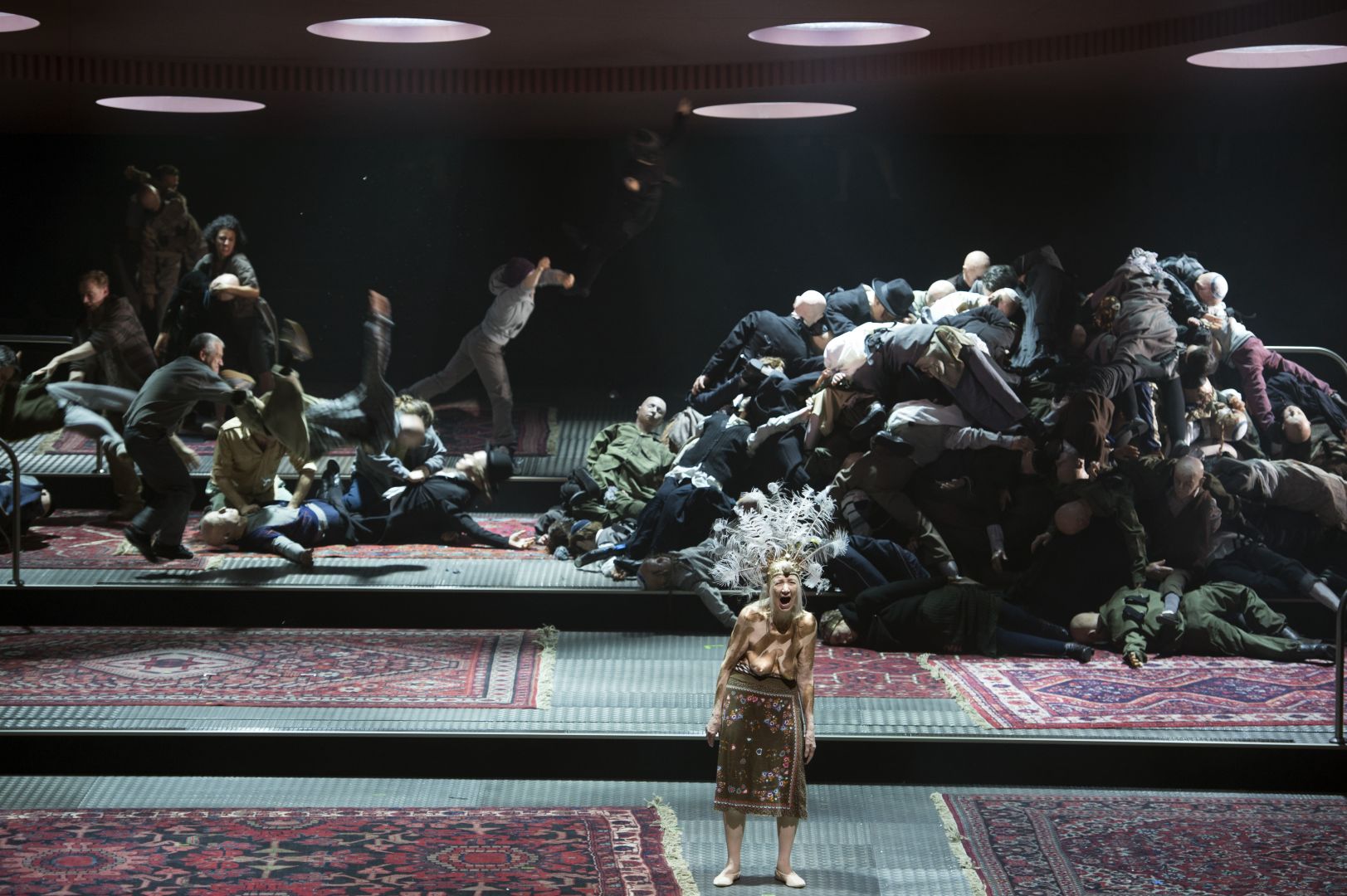 La scena di Klaus Grünberg è vuota, solo alcune gradinate con mancorrenti e tappeti orientali per terra: in uno di questi si presenta avvolto Mosè all’inizio e sotto lo stesso sparirà alla fine, inghiottito dal mucchio di cadaveri/pupazzi. Nel basso soffitto 12 (!) aperture circolari illuminano la scena con una luce fissa. La scenografia la fanno i corpi dei coristi, qui gli eccellenti membri del coro del teatro rimpinguati dal Vocalconsort Berlin e dalle voci bianche del Kinderchor. Robert Hayward (Moses) e John Daszak (Aron) interpretano con molta efficacia i due personaggi biblici.
