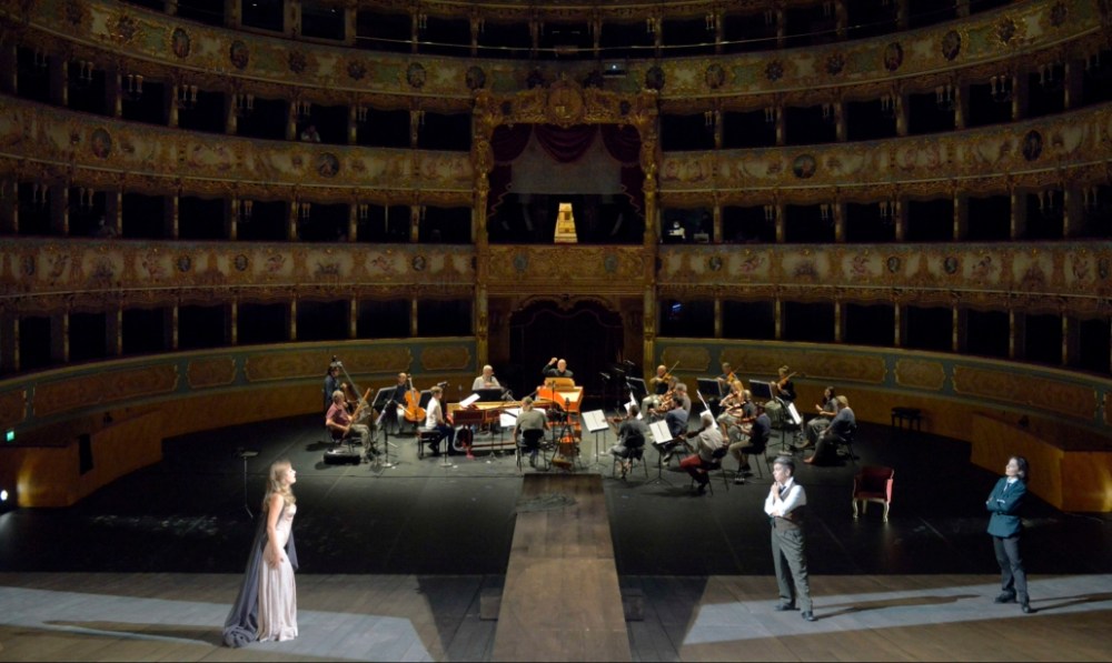 Una struttura lignea che ricorda la chiglia di una nave in costruzione costituisce un’installazione permanente in questa fase particolare di apertura de La Fenice. La mancanza di sipario e l’eliminazione dei settori classici del teatro come li conosciamo da più di quattrocento anni (platea, spazio per l’orchestra, palcoscenico) costringono a pensare a una nuova visione teatrale che il regista Giovanni Di Cicco ha solo in parte risolto. La sua è una mise-en-espace che non fa molto per dare corpo all’esile drammaturgia dell’Ottone in villa, che rimane quella che è: una sequenza di ventotto splendide arie precedute ognuna da un recitativo. I cantanti, rimanendo a debita distanza, espongono i loro numeri musicali senza eccessivo coinvolgimento psicologico o sviluppo drammatico – d’altronde difficile da trovare nel libretto di Domenico Lalli, dove il protagonista dell’opera non è l’Ottone del titolo, bensì la spregiudicata Cleonilla (che ha ben sette arie contro le quattro di Ottone). La donna non solo corrisponde con l’inganno all’amore dell’imperatore, ma alterna i suoi interessi erotici tra il «giovane bellissimo» Caio e il «forestiero» Ostilio – che si rivelerà essere una donna, fatto che scagionerà definitivamente Cleonilla agli occhi del rimbambito imperatore.