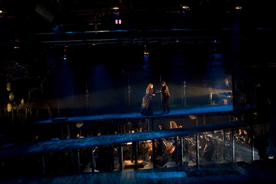 La mancanza di profondità del palcoscenico è genialmente risolta ponendo strumentisti e interpreti vocali su piani diversi: tre aeree piattaforme permettono ai cantanti di muoversi al di sopra dell’orchestra piazzata di sotto. Per una volta suoni e voci sono alla stessa distanza e la musica si sviluppa dal basso, sotto i cantanti, le cui voci hanno quindi una maggiore evidenza. L’ambientazione, se così si può dire, di questa scenografia ridotta all’osso è quella dell’epoca della rappresentazione (1902) con strani macchinari e vecchi proiettori le cui luci creano l’atmosfera della scena della grotta (atto II, scena prima) o della torre (atto III, scena prima) in maniera semplice ed efficace in cui la quasi perenne oscurità è perforata da fasci di luce radente – l’efficace design luci è di Matthew Haskins. Nel castello di Allemonde i personaggi, in pesanti costumi tardo vittoriani di Madeleine Boyd (che disegna anche la scenografia), si muovono su pedane semoventi (2) e Arkel è su una sedia a rotelle, tutto è manovrato a distanza da una serva: ad Allemonde dominano rigidità e immobilismo. Anche alcuni elementi architettonici (una finestra, frammenti di colonne, una lampada) si muovono su rotaie: il castello è come una macchina, un meccanismo repressivo dell’era industriale moderna, un ambiente che, come Mélisande, non è felice. Gli abitanti hanno sempre a che fare con sotterranei e abissi minacciosi appena sotto i loro passi – chiara metafora dell’inconscio che si andava rivelando in quegli stessi anni nello studio viennese di Sigmund Freud. Mélisande porta un temporaneo sollievo a questa atmosfera opprimente e Arkel lascia la sedia a rotelle e muove i primi passi. La presenza di tre serve mute aggiunge una strana tensione nel misterioso castello. Le stesse donne appariranno alla fine quali angeli della morte attorno al corpo senza vita di Mélisande.