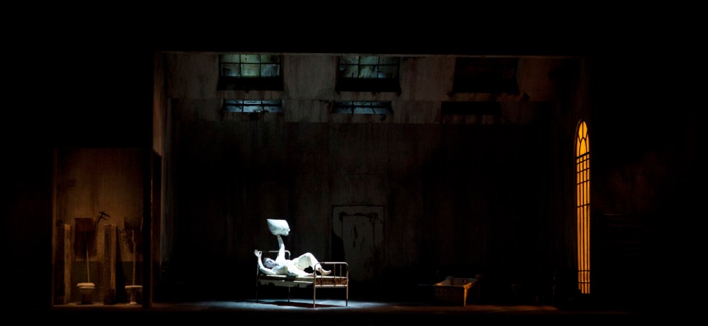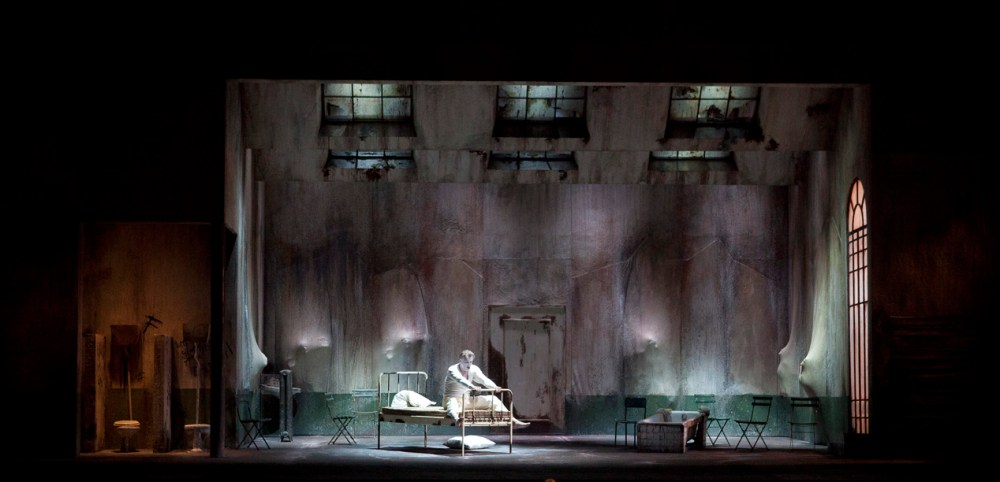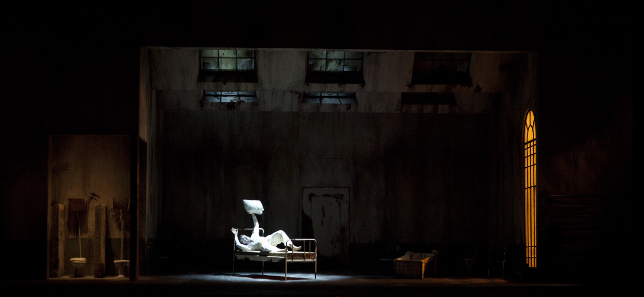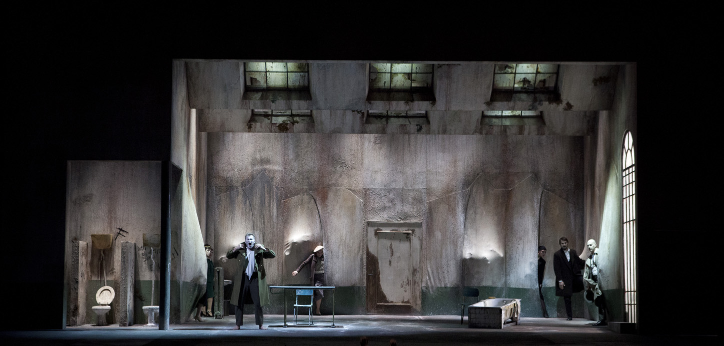 Lo spettacolo arriva dalla Welsh National Opera di Cardiff e l’allestimento di Alessandro Talevi immerge immediatamente lo spettatore in un’atmosfera cupa e mortifera: mai si accende la minima scintilla di speranza, soprattutto con la spettrale  illuminazione di Matthew Haskins. Nella scenografia di Madeleine Boyd, che disegna anche i costumi dark-gothic, l’arredamento del palazzo col suo tetto di vetro sporco lascia intuire le inquietanti ombre delle mani dei cortigiani e non meno lugubre è il palazzo di Nottingham con delle strette colonne/alberi che alla fine vedremo diventare i pali su cui infilzare le teste dei giustiziati. Su una terrificante protesi aracnoide salirà nel terzo atto la regina-ragno, da cui scenderà poi senza parrucca e senza voglia di vivere, pronta ad abdicare.