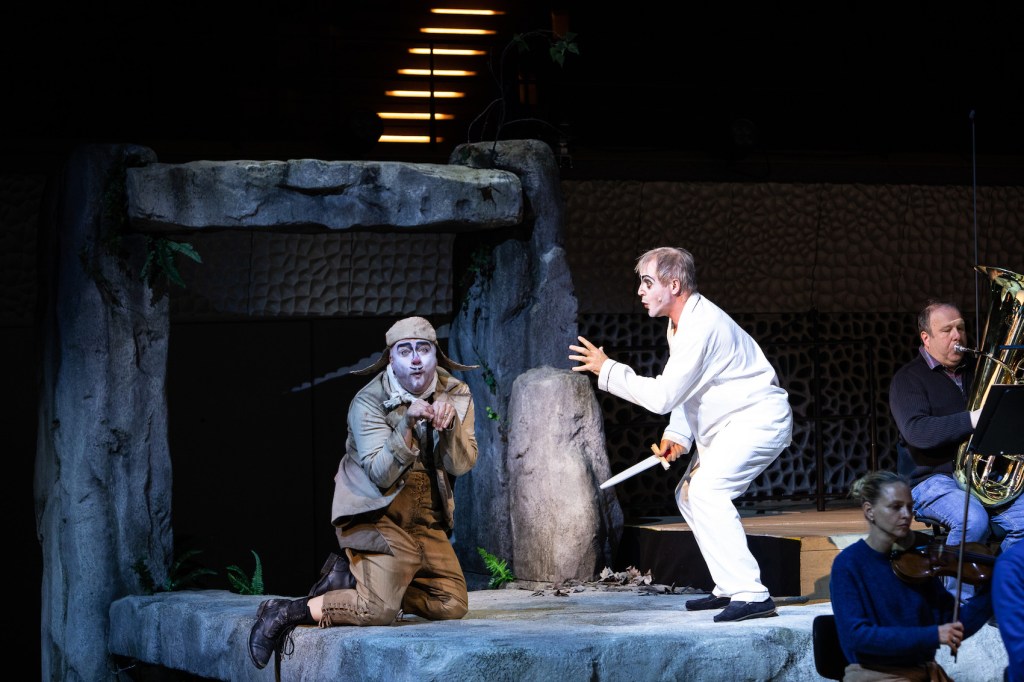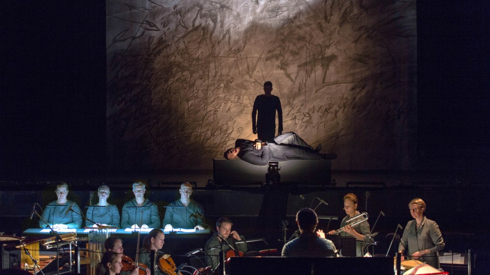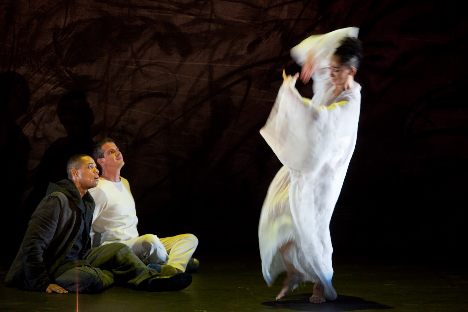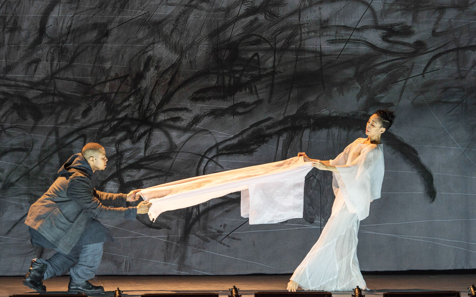 Sintesi di modi linguistici ed espressivi differenti, la musica della Saariaho qui raggiunge una grande asceticità nel suo voluto minimalismo: in scena un controtenore e un baritono, in buca un quartetto vocale, un quartetto d’archi, percussioni, flauto e kantele (la cetra finlandese che ricrea il koto giapponese), ed elettronica. Con questi pochi mezzi in direttore André de Ridder restituisce un universo di sonorità ora dissonanti ora modali dove momenti percussivi si alternano a fragili fruscii o polifonie vocali inframmezzano lunghi melologhi. Preziosa nei particolari, la scrittura musicale non arriva però a costruire una tensione drammaturgica e la fascinazione del momento col tempo conduce a una certa sensazione di monotonia.