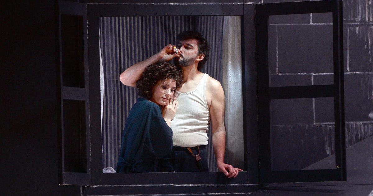 Tonio è uno Jago che per fomentare la patologica gelosia di Canio invece del fazzoletto usa la cravatta che Silvio ha perso dopo il suo ultimo incontro con Nedda. Qui è Dimitri Platanias, che la ricanterà nell’allestimento di Pappano/Michieletto a Londra a dicembre dello stesso anno. Drammaturgicamente convince poco, ma vocalmente è efficace. La Nedda della Agresta è manierata e vocalmente neanche lei convince. Il suo duetto con un Silvio deludente non decolla mai: teatralmente e musicalmente questo è il momento meno felice dello spettacolo. Bella la voce del giovane tenore turco Tansel Akzeybek che aspettiamo in un ruolo più impegnativo di questo di Beppe.