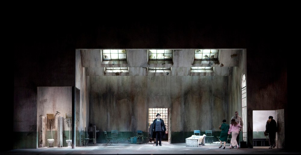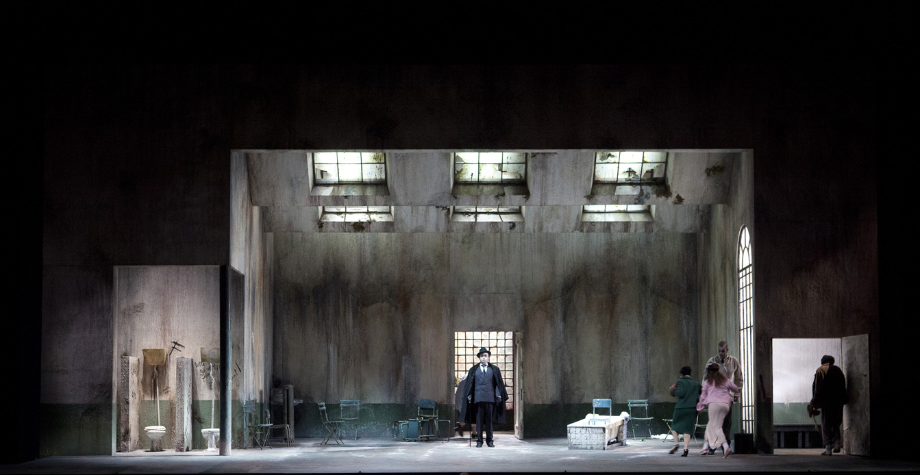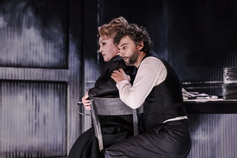 Un paesaggio urbano alla Sironi (ciminiere fumanti e case grigie), ma disegnato con il tratto di Lyonel Feininger e tutto in bianco e nero come in un film degli anni ’20 quello messo in scena da Philipp Stölzl a Salisburgo nel 2015 per la prima parte della tradizionale accoppiata Cavalleria rusticana/Pagliacci. Durante l’introduzione si scopre un palcoscenico suddiviso in sei moduli su due livelli: uno di questi è una soffitta in cui Jonas Kaufmann sfoggia un inatteso accento siciliano (con le t retroflesse di truovo, trasu) e intona a mezza voce, rivolto con le spalle alla platea, la siciliana che abbiamo sempre sentito cantare a squarciagola – una soluzione che sembra l’unica drammaturgicamente logica trattandosi di un adultero che di certo non va a urlare in piazza della sua infatuazione per la moglie di un altro… Sembra pentito di quello che ha fatto con Lola, che vediamo affacciarsi da un abbaino vicino, ma… aspetta: dalla porticina entra un ragazzino, il figlio! E poi Santuzza, piuttosto torva in verità, che viene a rimestare sulla stufa la minestra del magro pranzo. Suona la campana e il ragazzino viene vestito da chierichetto per la processione che si prepara nella strada in basso. Vediamo poi mamma Lucia gestire traffici illeciti e Alfio capo mafioso in completo gessato con la frusta che non usa per il cavallo ma per minacciare e ottenere dalle vittime il pagamento del pizzo, che consegna poi alla vecchia. Il duetto tra Turiddu e Santuzza avviene sul pianerottolo di fronte alla porta di Lola, quello tra Turiddu e la madre attorno al tavolo su cui lei continua a tenere i conti. Mamma Lucia neanche si avvicina al figlio, altro che «un bacio, mamma… un altro bacio…»!